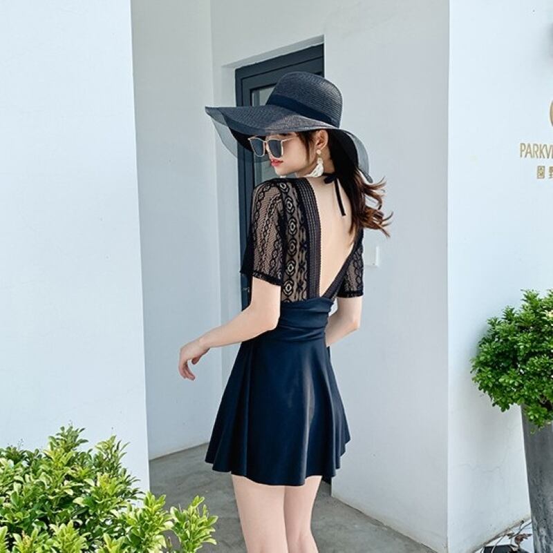 水着 レディース ワンピース 長袖 半袖 レース シースルー Vネック 刺繍 胸元 ホルダーネック スカート ノンワイヤー ハイウエスト きれいめ セクシー 大人っぽい おしゃれ 体系カバー 着痩せ プレゼント 定番 送料無料 M L XL 2XL ホワイト ブラック