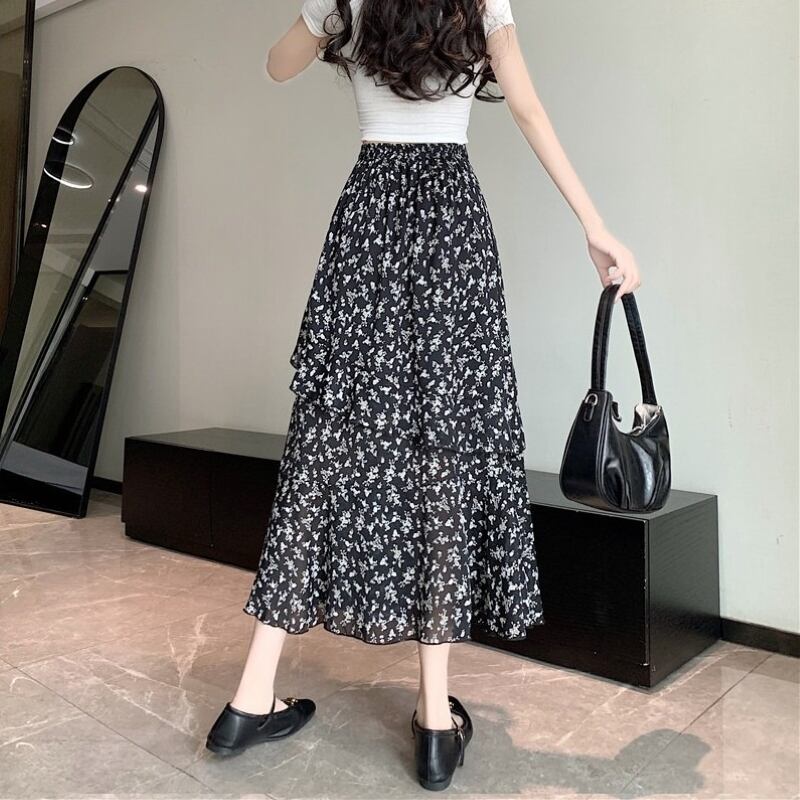 スカート ロングスカート フレアスカート ミモレ丈 ロング 花柄スカート フリルロングスカート Aライン サイドスリット ハイウエスト ウエストゴム 透け感 きれいめ 大人 おしゃれ 大人可愛い 大人女子 セクシー 存在感 小花柄 春 夏 レディース デート お出かけ 休日 旅行 普段使い 韓国系 スタイル 楽ちん 送料無料 M L XL 2XL 3XL 4XL ゆったり サイズ ホワイト ブラック