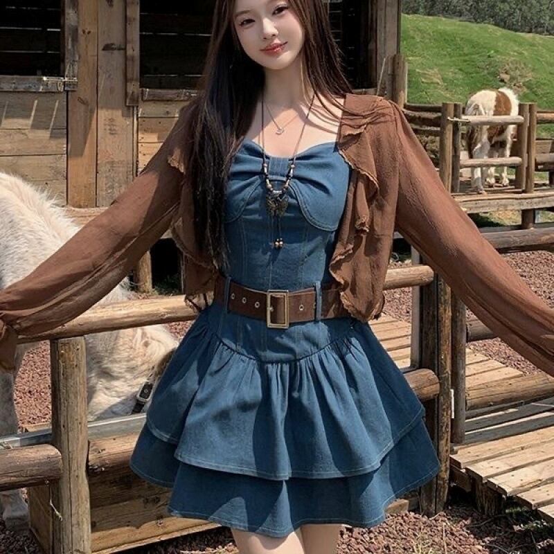 デニムワンピース レディース ティアードスカート ミニ丈 ノースリーブ キャミソール フリルデニム 2点セット きれいめ 大人 おしゃれ レトロ 大人女子 こなれ感 キュート セクシー 春 夏 秋 デート お出かけ 休日 旅行 普段使い 韓国系 スタイル 送料無料 S M L XL ブルー