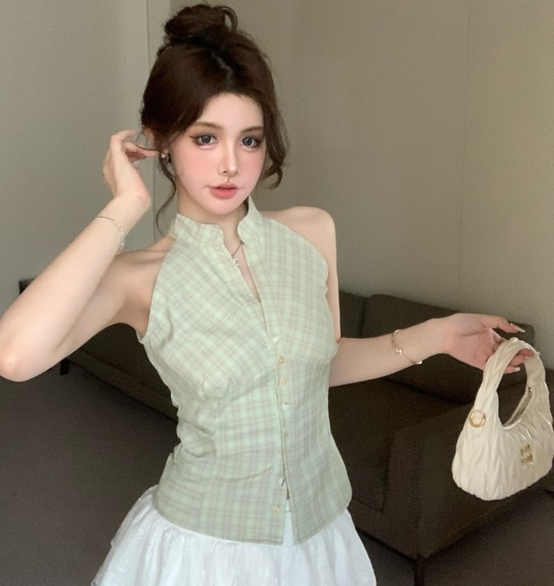 トップス シャツ ブラウス ホルターネック シャツ ノースリーブ Ⅴネック 前開き 大人 おしゃれ 大人可愛い 大人女子 セクシー エレガント 存在感 チェック柄 春 夏 レディース デート お出かけ 休日 アウトドア イベント リゾート 旅行 普段使い 韓国系 スタイル 送料無料 S M L XL ブルー グリーン ピンク