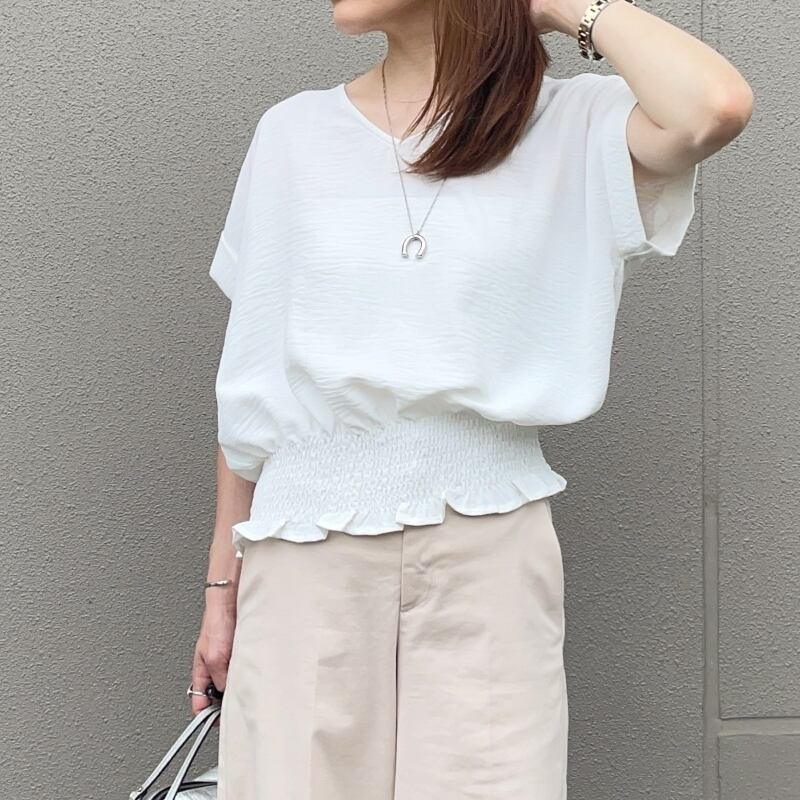 春夏のコーディネートに最適なアイテム、ウエストシャーリング Ⅴネックブラウスのご紹介です!エレガントで上品なデザインが特徴で、大人のおしゃれを楽しむ女性にぴったりなスタイルを実現します。