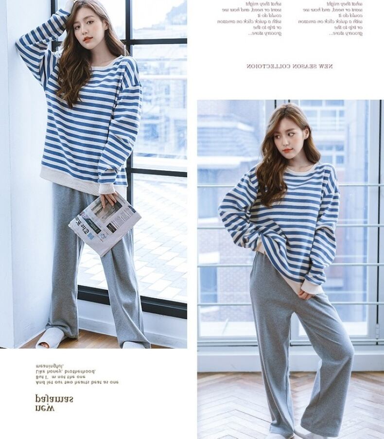 ルームウェア パジャマ 部屋着 寝巻き レディース セットアップ ロングTシャツ ロングパンツ コットン プルオーバー 長袖 ウエストゴム 伸縮性 上下セット きれいめ シンプル 大人 おしゃれ 大人女子 とろみ感 ストライプ 春 秋 冬 お出かけ 旅行 普段使い 体系カバー 定番 送料無料 M L XL 2XL ゆったり サイズ ブラック ブルー