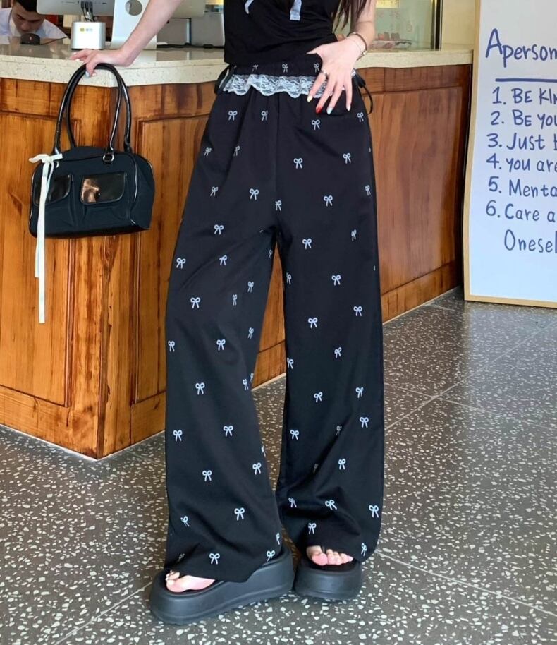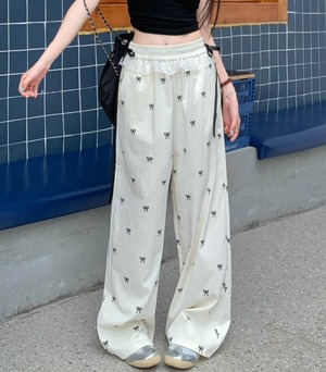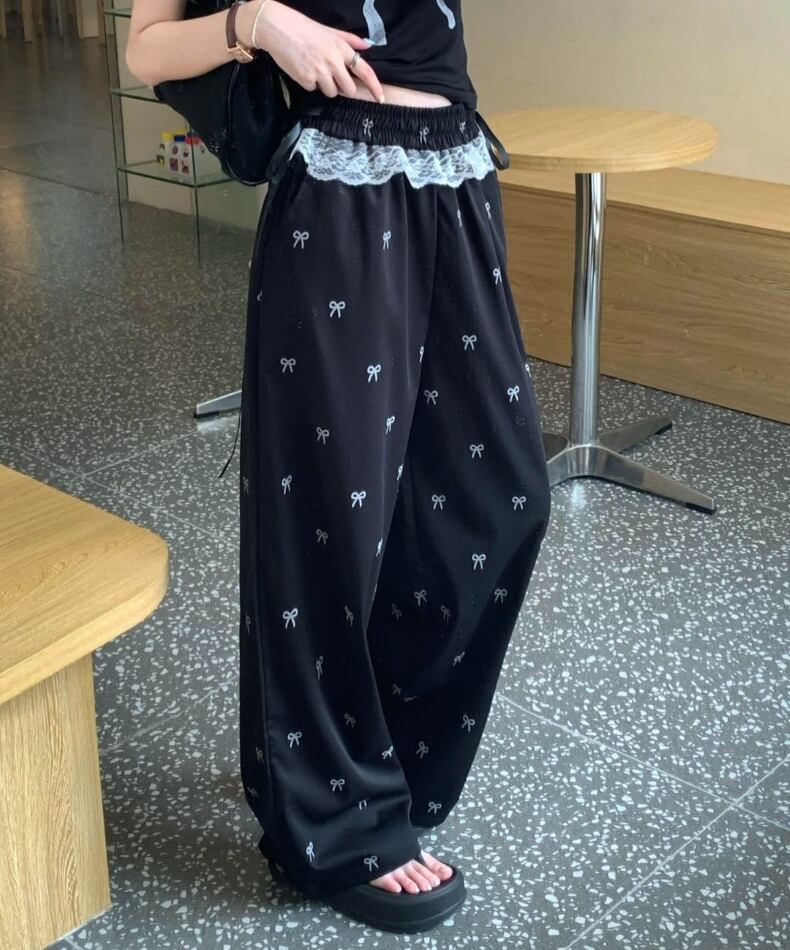 レディース スウェット パンツ リボン柄 ワイドパンツ ウエストゴム レース リボン ハイウエスト ロングパンツ カジュアルパンツ ボトムス 大人 おしゃれ 大人可愛い 大人女子 キュート 春 夏 デート お出かけ 休日 旅行 着回し 韓国系 スタイル 美脚 送料無料 S M L XL ホワイト ブラック
