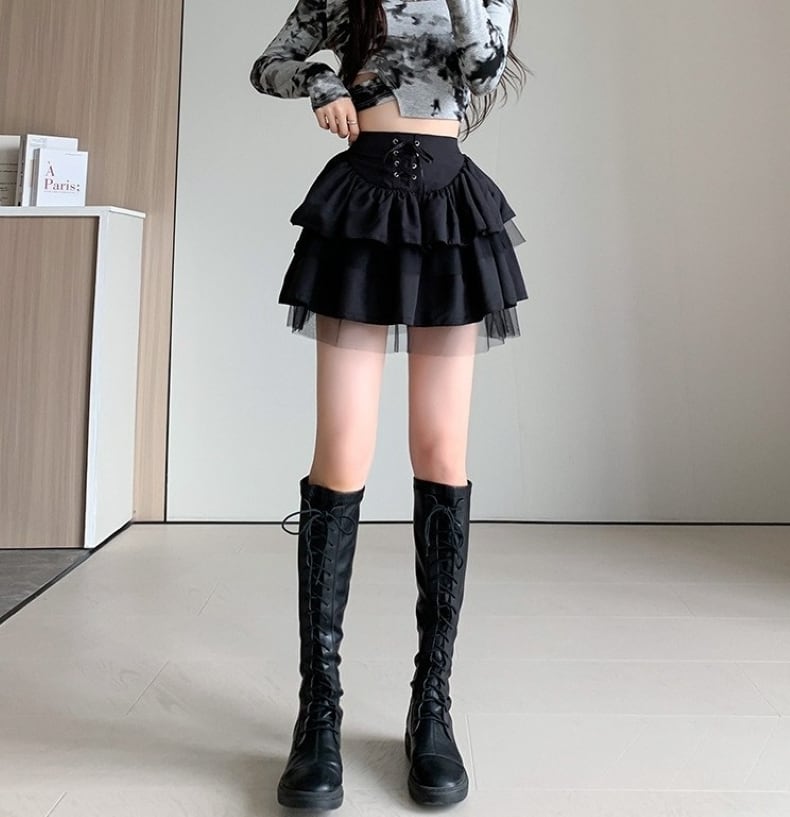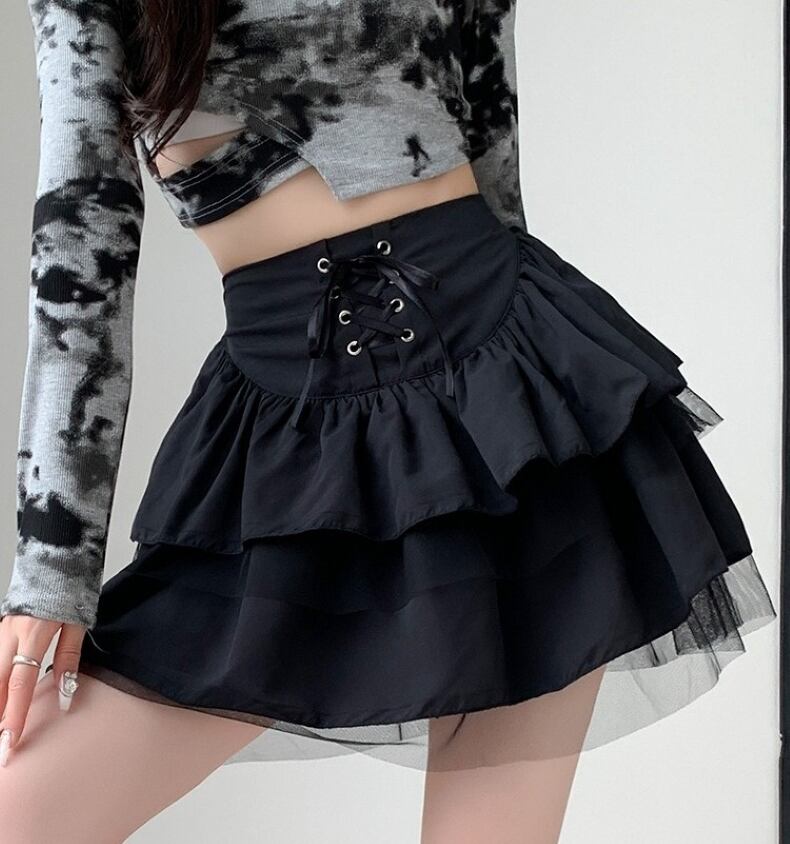 スカート ミニスカート ティアードスカート 切り替え チュール レディース ショート丈編み上げデザイン コルセット風 フレア Aライン ハイウエスト 大人 おしゃれ 大人可愛い 大人女子 キュート 存在感 春 秋 デート お出かけ 休日 旅行 普段使い 韓国系 スタイル 美脚 脚長 送料無料 S M L XL 2XL ブラック