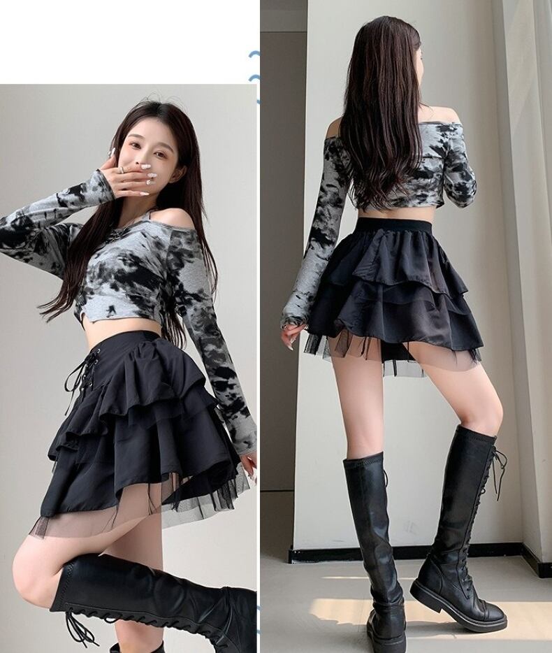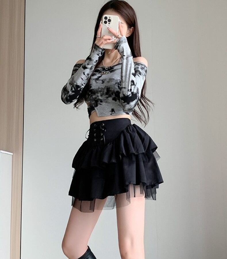 春秋にぴったりな大人可愛いティアードミニスカートのご紹介です!こちらのスカートは、切り替えデザインとチュール素材を使用し、華やかな印象を与えつつも軽やかな着心地を実現。コルセット風の編み上げデザインがスタイルを引き立て、美脚効果も抜群です。