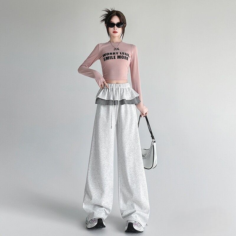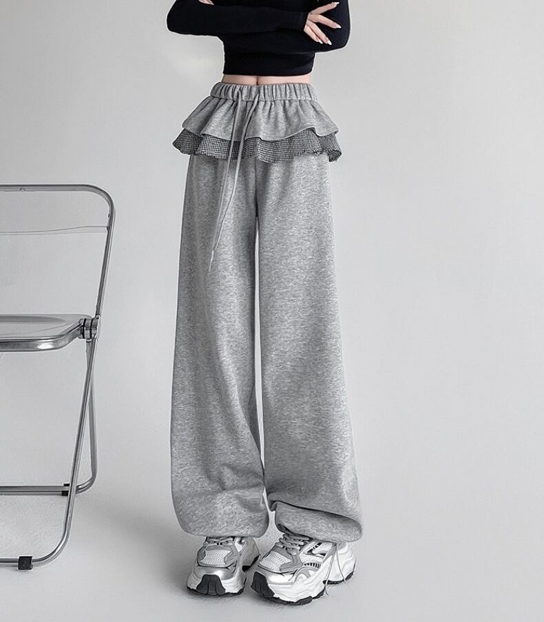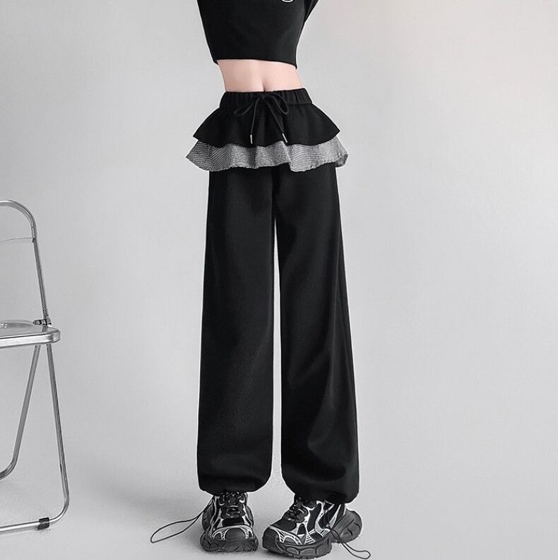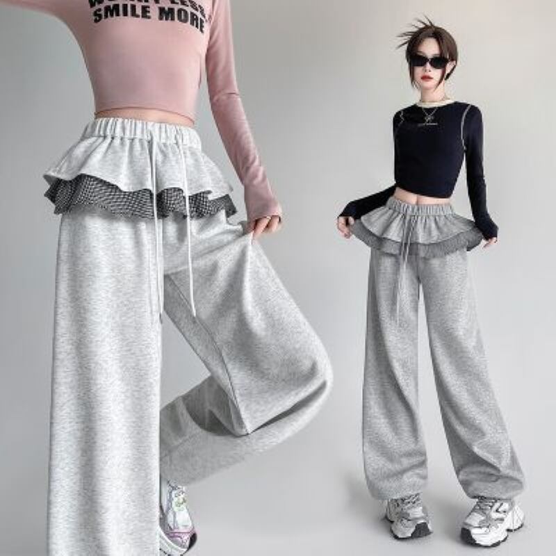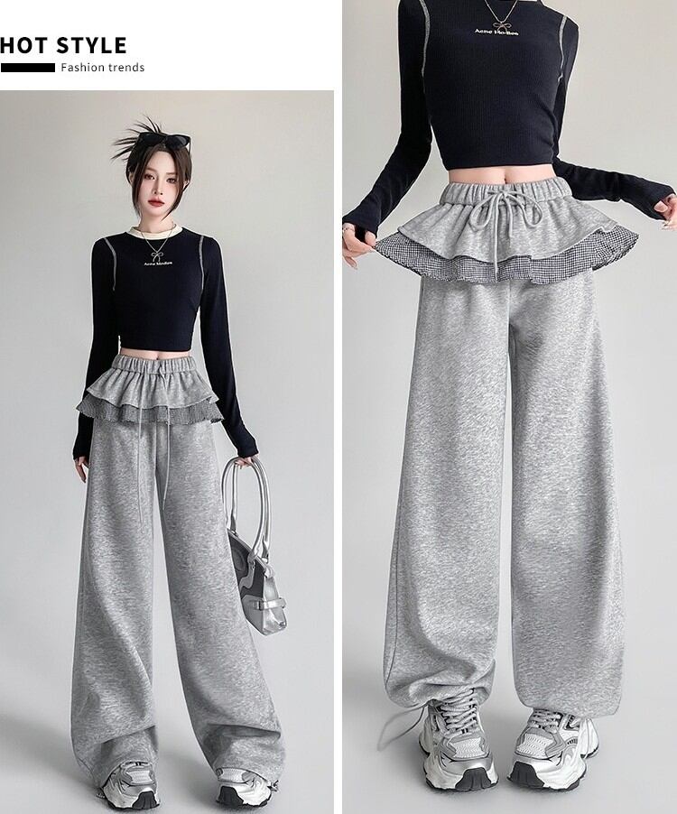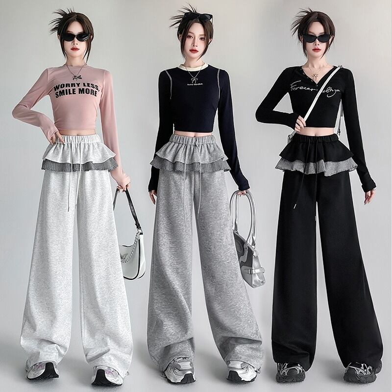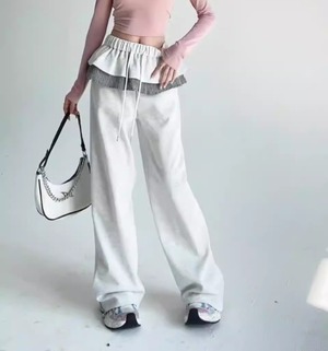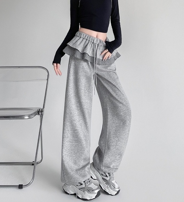 ボトムス パンツ スウェット ワイドパンツ ウエストフリルドロストスウェットパンツ フリル 切り替えデザイン ハイウエスト ウエストゴム 伸縮性 大人 おしゃれ 大人可愛い 大人女子 ラブリー 存在感 秋 冬 お出かけ 休日 運動 旅行 普段使い 韓国系 スタイル 体系カバー 送料無料 S M L XL 2XL ブラック グレー ホワイトグレー