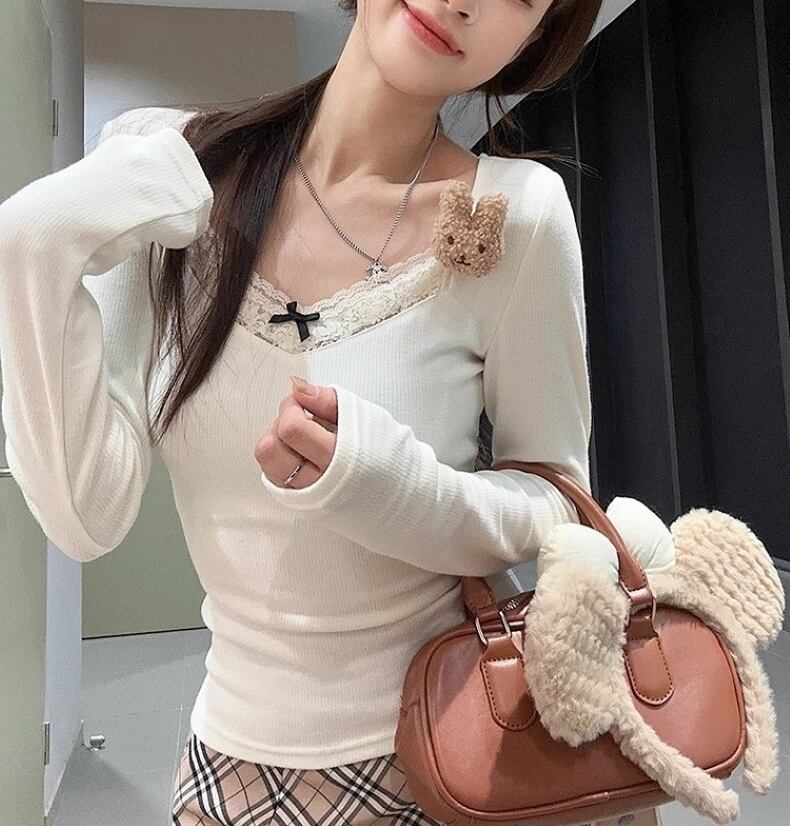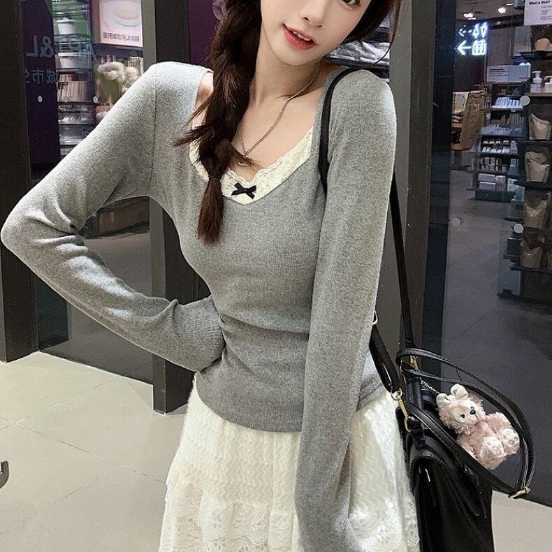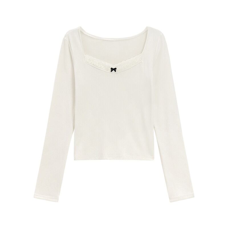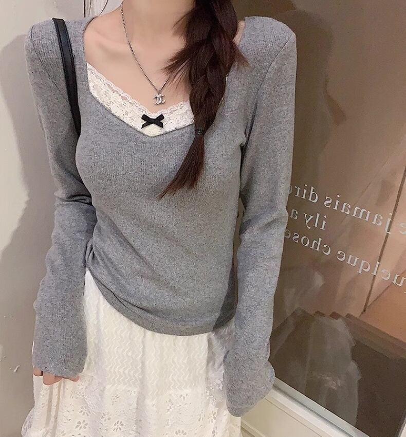 レディース トップス カットソー ニットソー レースリボン インナートップス 長袖 スリムフィット 薄手 大人 おしゃれ 大人可愛い 大人女子 キュート 春 秋 デート お出かけ 休日 旅行 普段使い 韓国系 スタイル 送料無料 S M L XL グレー オフホワイト
