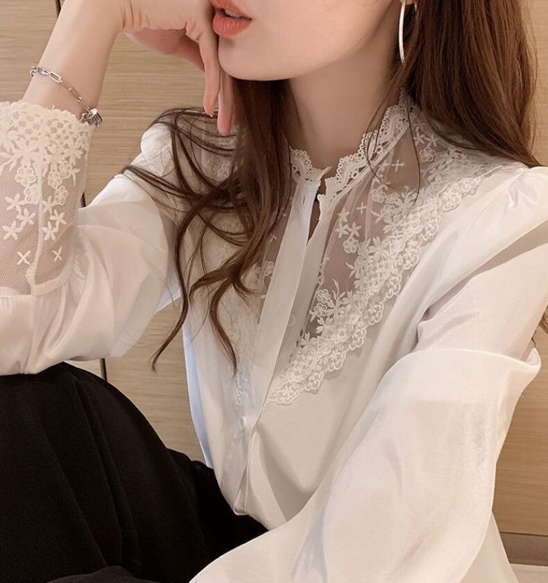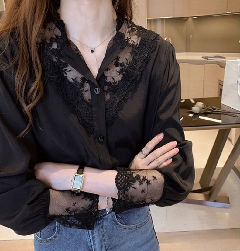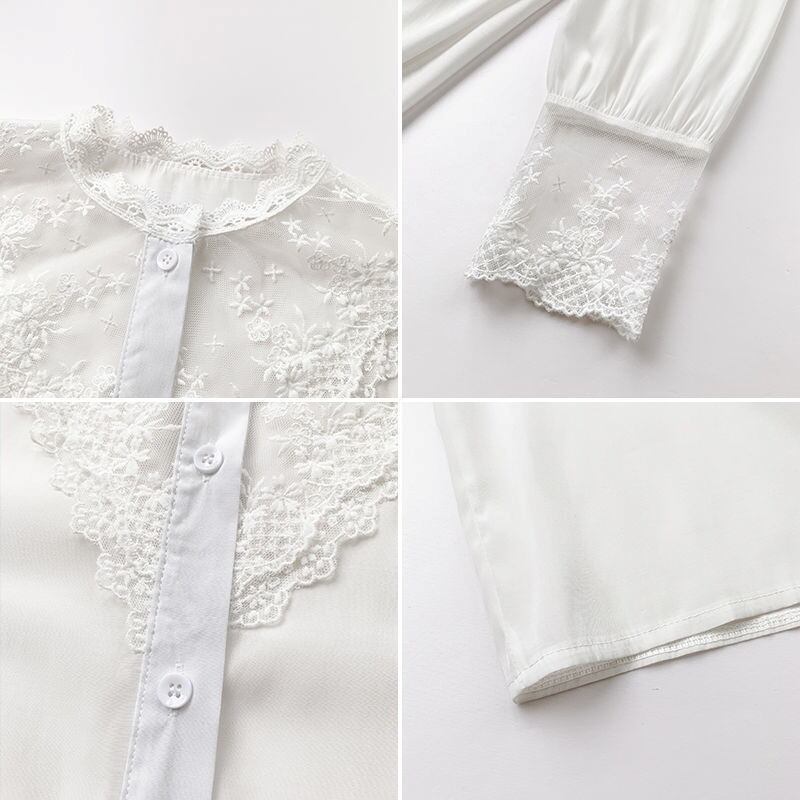 トップス シャツ ブラウス レディース 刺繍 レースブラウス 長袖 シャツ レース シフォン 前開き 透け感 薄手 きれいめ 大人 お洒落 大人女子 セクシー エレガント 春 秋 お出かけ 運動 旅行 普段使い 体系カバー 送料無料 S M L XL 2XL ホワイト ブラック