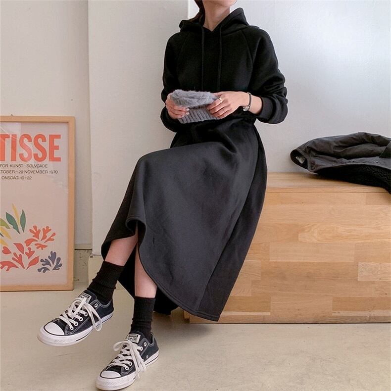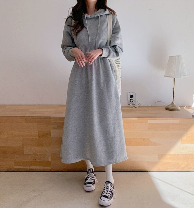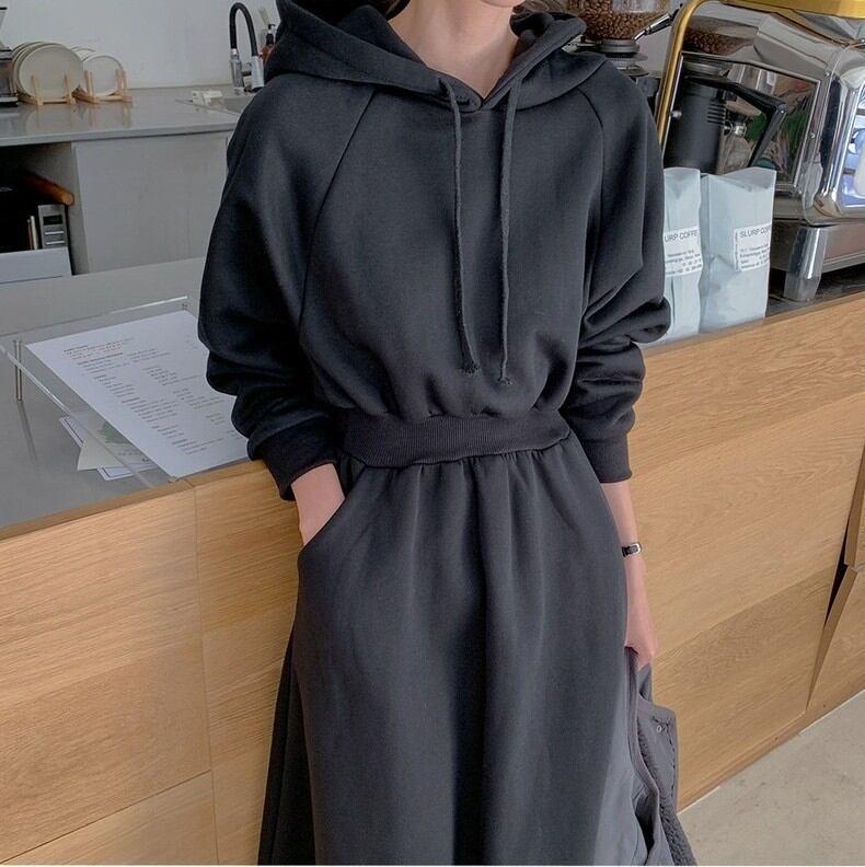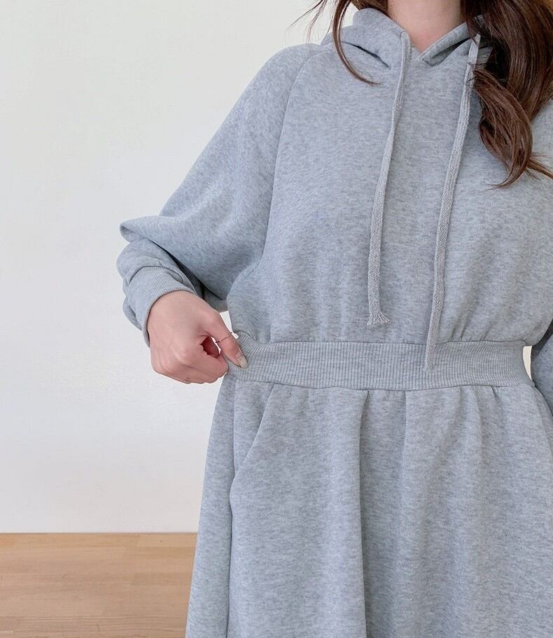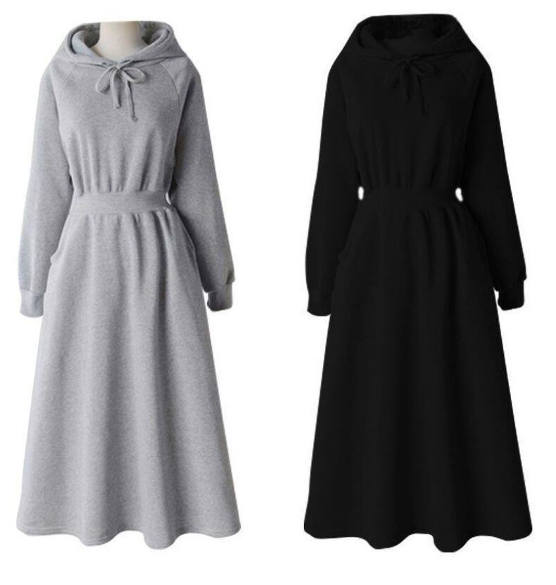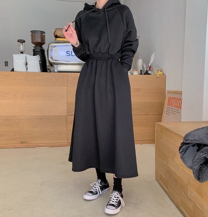 フレアパーカー ワンピース スウェットパーカーワンピース ロングワンピース 長袖 Aライン ウエストマーク ハイウエスト ニット 厚手 きれいめ シンプル カジュアル 大人 おしゃれ 大人女子 エレガント 無地 秋 冬 レディース デート お出かけ 休日 旅行 普段使い 暖かい 体系カバー 送料無料 M L XL 2XL ブラック グレー