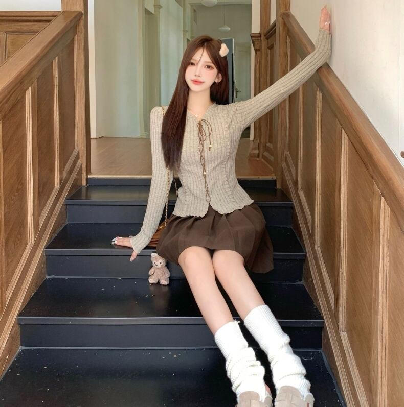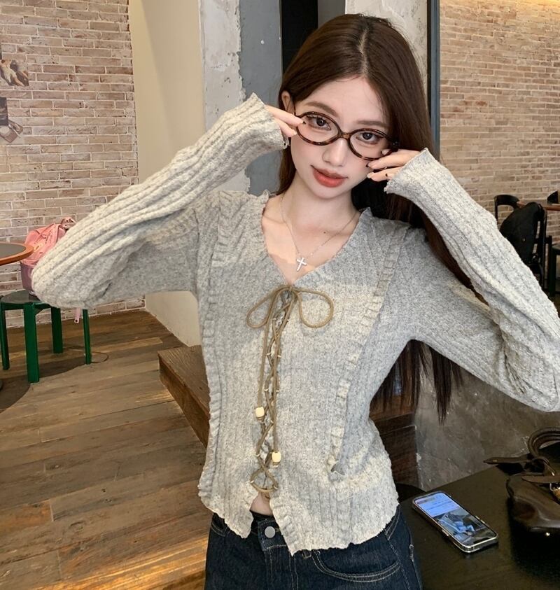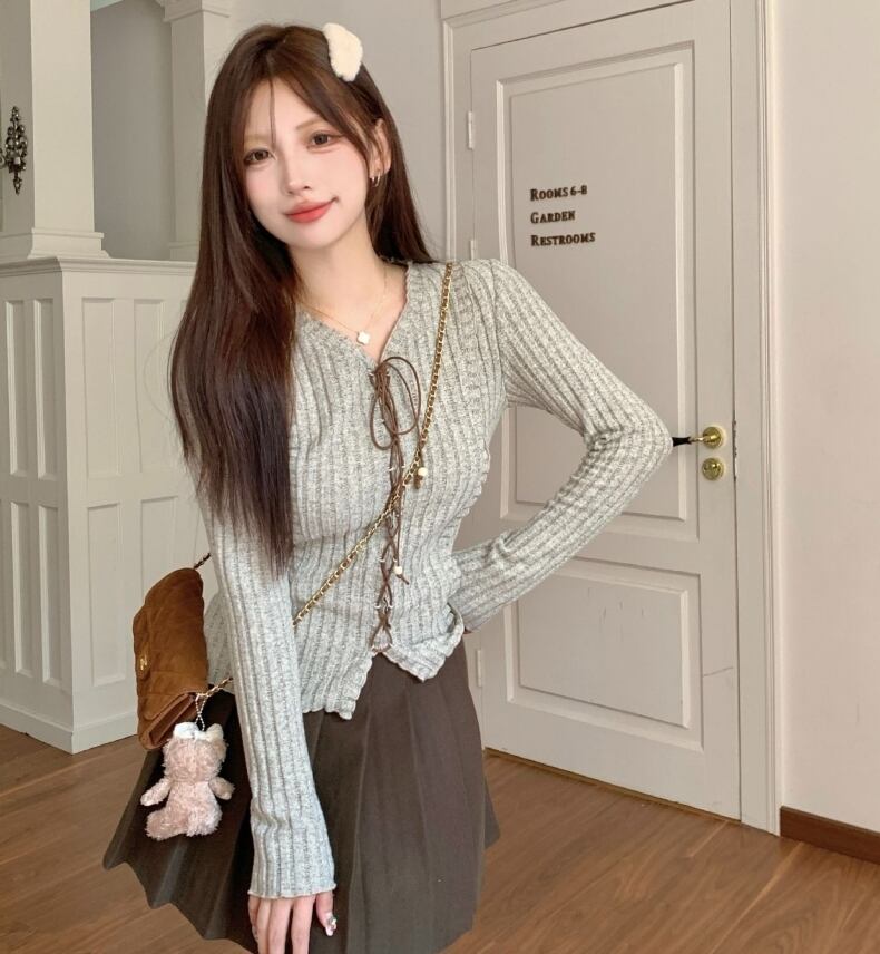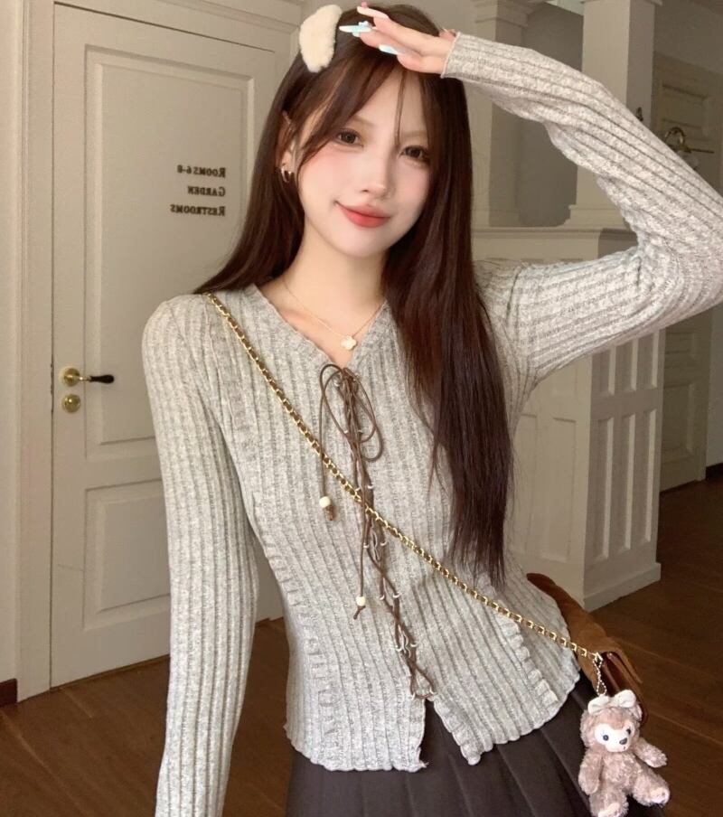 レディース トップス カットソー セーター カーディガン 長袖 Vネック リボン 編み込み カジュアル 大人 おしゃれ レトロ 大人可愛い こなれ感 とろみ感 春 秋 冬 デート お出かけ 休日 旅行 普段使い 韓国系 スタイル 送料無料 S M L XL カーキ