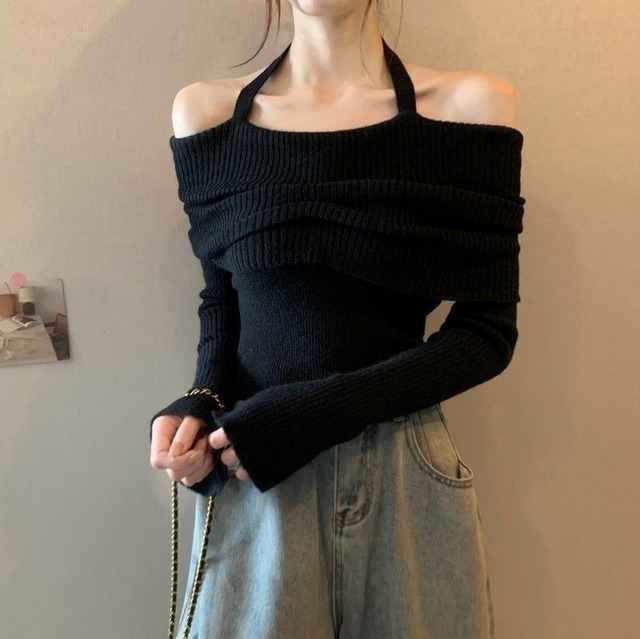 ホルターネック ニットトップス レディース ニットソー セーター ショート丈 長袖 オフショルダー ホルターネック シャーリング リブ スリムフィット 大人 お洒落 大人女子 セクシー 存在感 春 秋 冬 デート お出かけ 休日 旅行 普段使い 楽ちん 暖かい 定番 送料無料 フリーサイズ ブラック グレー モカ アイボリー