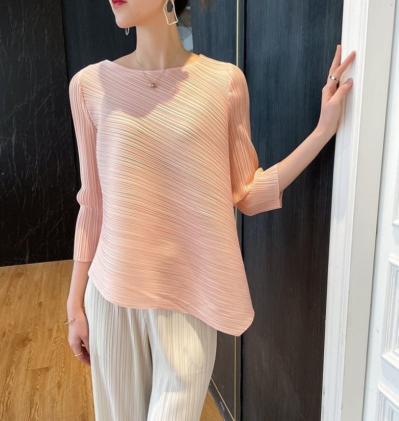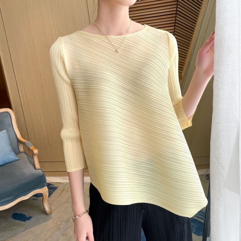 レディース トップス シャツ ブラウス プルオーバー 7分袖 ラウンドネック プリーツブラウス きれいめ シンプル 大人 上品 お洒落 エレガント 存在感 とろみ感 春 秋 デート お出かけ 休日 旅行 普段使い 楽ちん 体系カバー プレゼント 送料無料 フリーサイズ ゆったり サイズ
