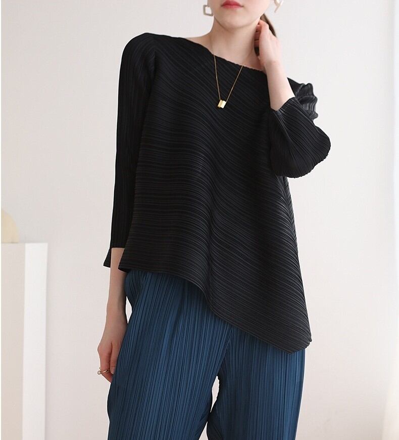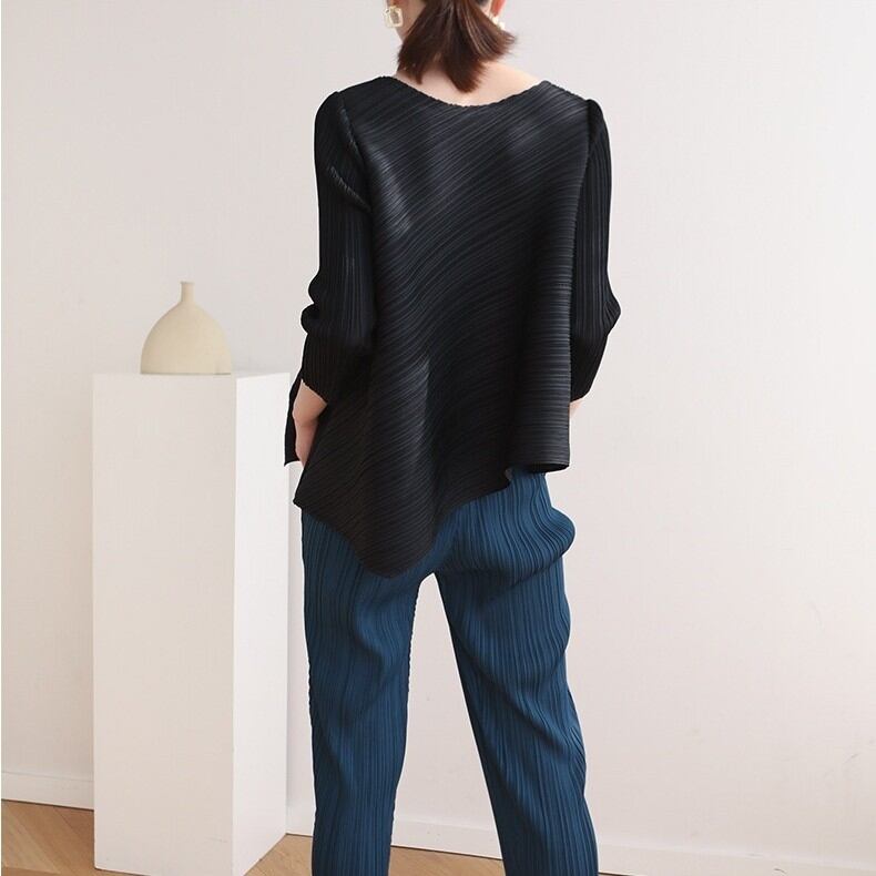 シンプルながらも存在感を放つプリーツブラウスは、体系カバーにも優れており、普段使いとしても楽ちんにお召しいただけます。お洒落でエレガントな雰囲気を演出し、特別な日にも使いやすい一品です。