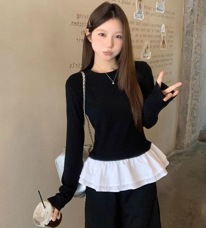 レディース トップス Tシャツ シャツ カットソー フリルTシャツ 長袖 ラウンドネック フリル 切り替えデザイン 大人 おしゃれ 大人可愛い 大人女子 キュート 無地 春 秋 冬 デート お出かけ 休日 旅行 韓国系 スタイル 送料無料 S M L XL ブラック