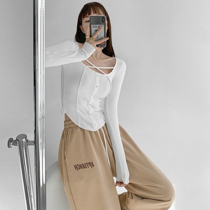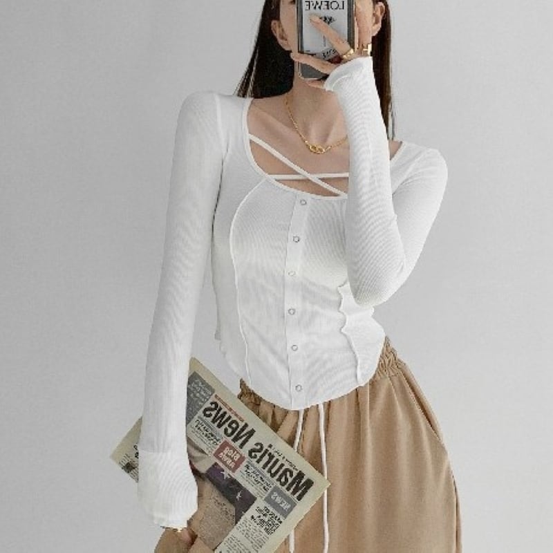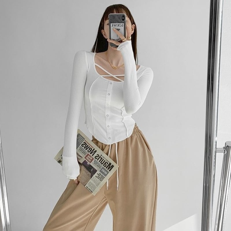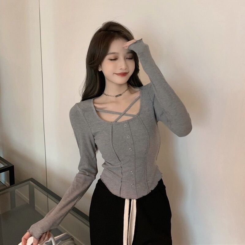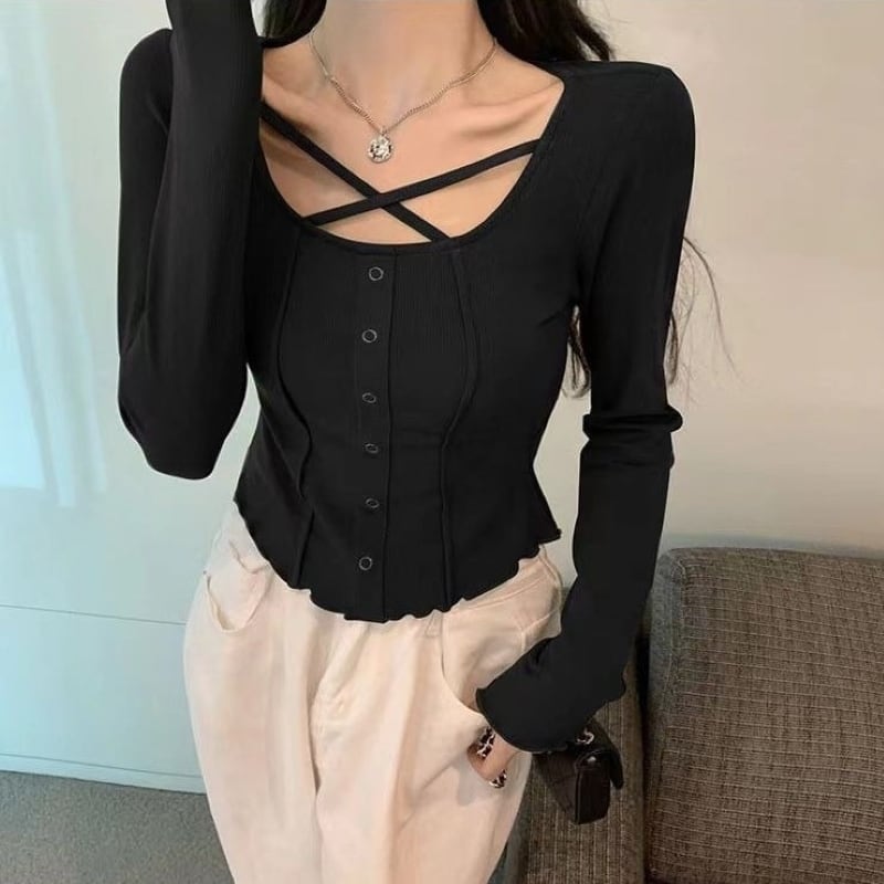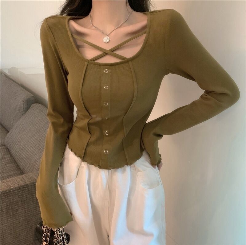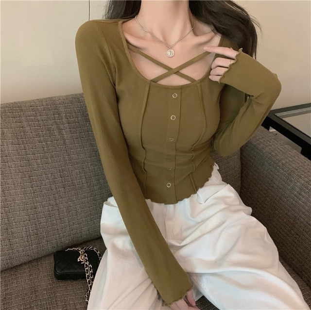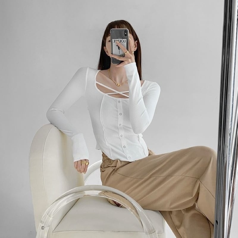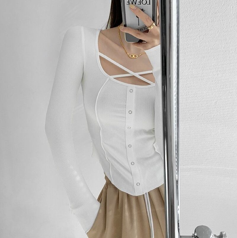 レディース トップス Tシャツ カットソー クロスストラップTシャツ 長袖 Uネック シンプル 大人 お洒落 大人女子 セクシー 存在感 春 秋 デート お出かけ 休日 旅行 普段使い 韓国系 スタイル 送料無料 S M L XL ホワイト ブラック グリーン グレー