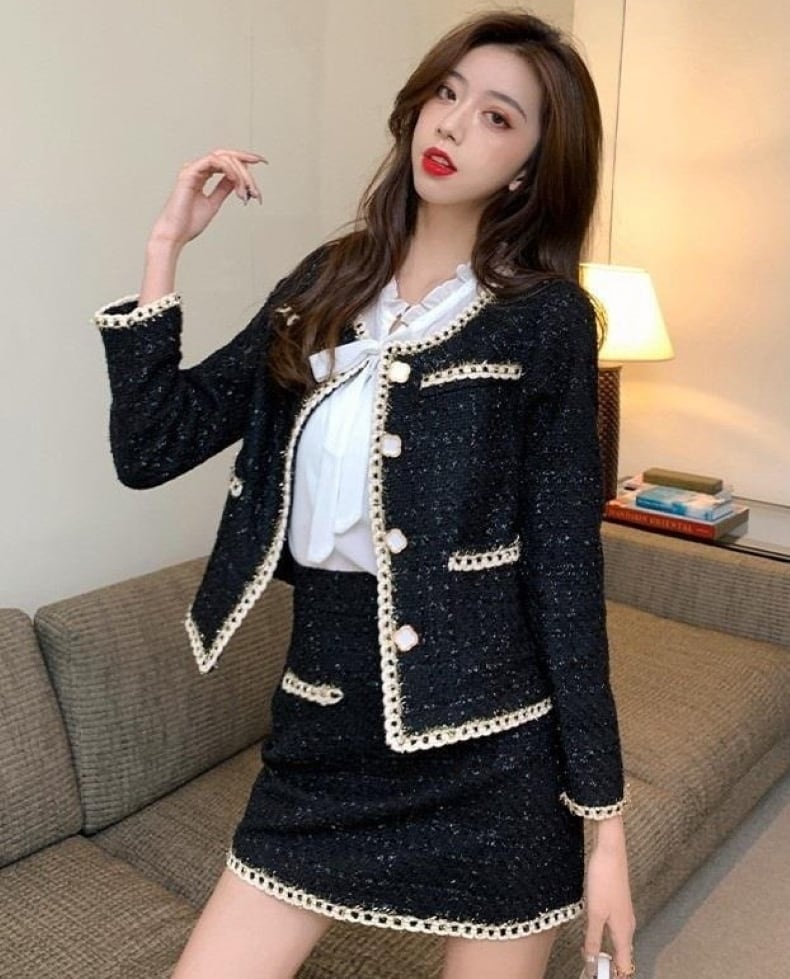 セットアップ ミニスカート ジャケット ブラウス 3点セット レディース ツイード ツーピース ノーカラージャケット 長袖 ツイードジャケット ミニスカート ツイードスカート きれいめ 大人 お洒落 セクシー エレガント 存在感 秋 冬 入学式 入園式 卒業式 卒園式 謝恩会 二次会 お出かけ 旅行 韓国系 スタイル 送料無料 S M L XL 2XL ブラック