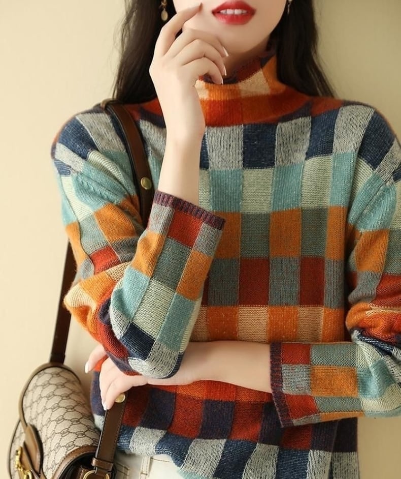 柔らかいニット素材が肌に心地よく、タートルネックやハイネックのデザインが上品さを演出します。チェック柄のマルチカラーが存在感を際立たせ、シンプルなボトムと合わせるだけでお洒落が完成します。長袖スタイルで、暖かさを保ちながらもコーディネートの幅を広げてくれます。