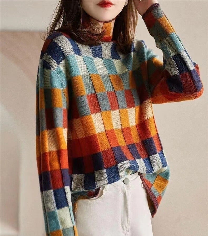 ニットトップス レディース セーター カットソー 長袖 ニットセーター チェック プルオーバー マルチカラー タートルネック ハイネック カジュアル 大人 お洒落 エレガント 存在感 チェック柄 春 秋 冬 デート お出かけ 休日 旅行 普段使い 送料無料 S M L XL 2XL