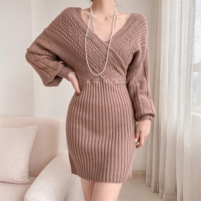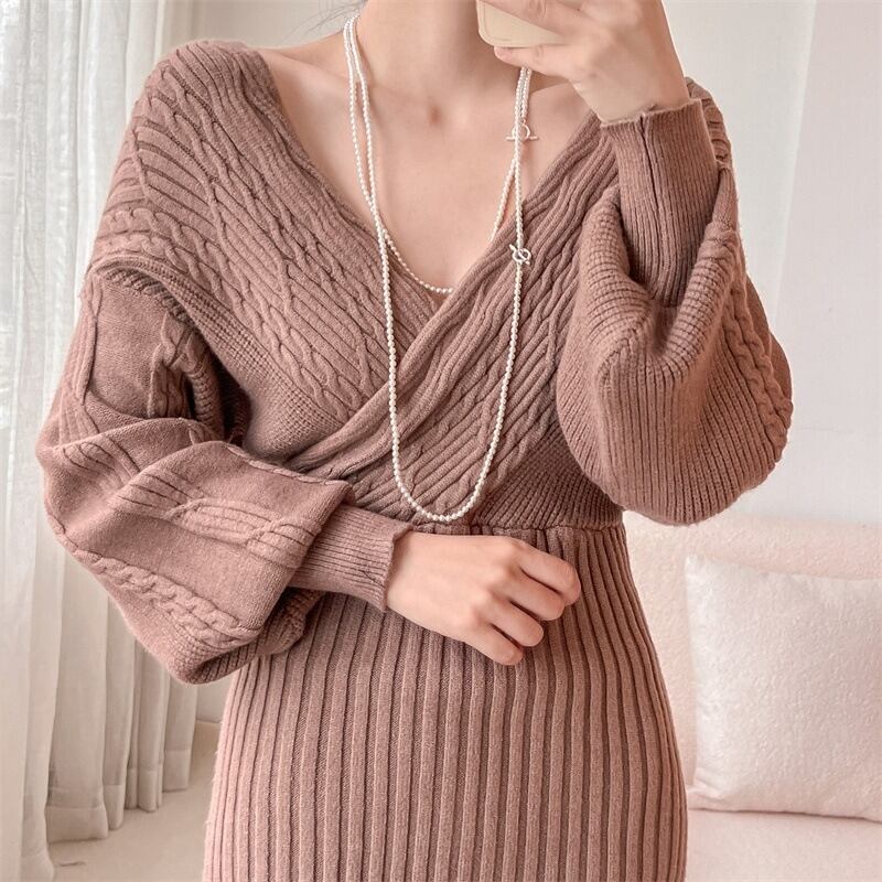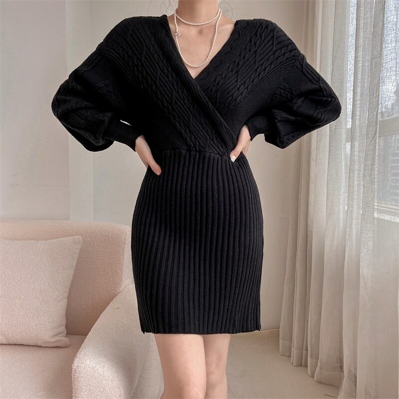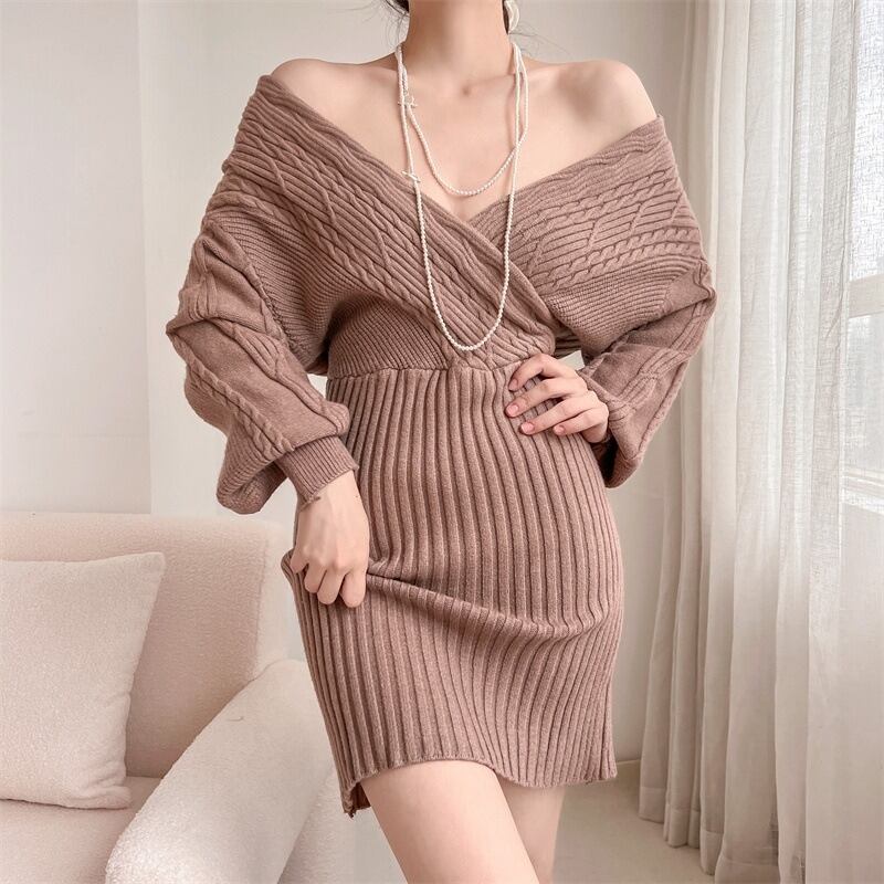 ワンピース レディース ニットワンピース リブニット 長袖 Vネック ケーブルニット オフショルダー ミニワンピース きれいめ 大人 お洒落 大人女子 セクシー エレガント 存在感 秋 冬 デート お出かけ 休日 旅行 普段使い 防寒 送料無料 S M L XL ブラック レッド カーキ アプリコット
