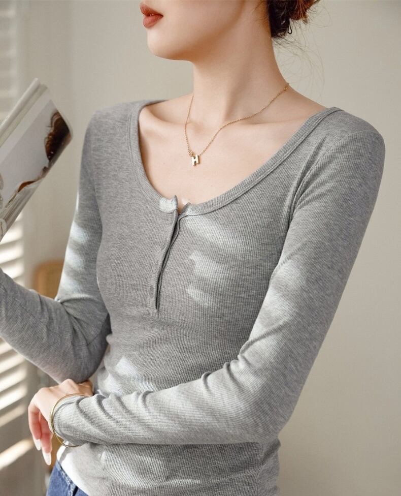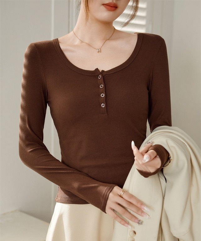 この長袖Tシャツは、伸縮性に富んだ素材で仕立てられており、着心地の良さが魅力です。Uネックのデザインは、首元をきれいに見せ、大人っぽさを演出します。シンプルでありながらもカジュアルさを兼ね備え、おしゃれな大人女子にふさわしいアイテムです。豊富なカラー展開(ホワイト、ブラック、コーヒー、ダークグレー、ライトグレー)で、どんなコーディネートにも合わせやすいのが嬉しいポイントです。