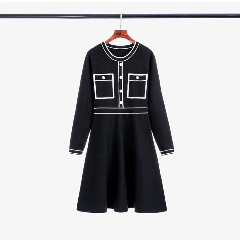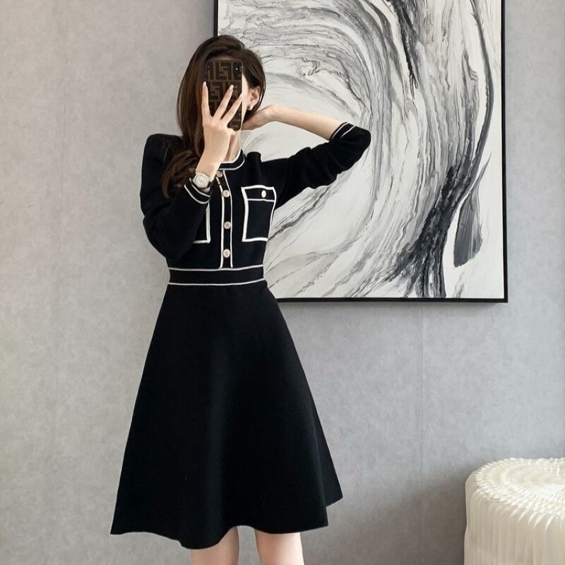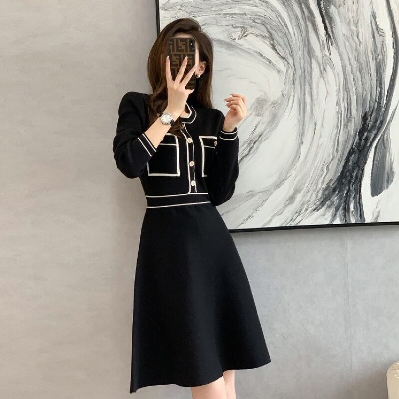 ワンピース レディース ニットワンピース 膝丈 長袖 Uネック Aライン ウエストマーク ニット きれいめ 大人 上品 おしゃれ 大人女子 エレガント 存在感 フォーマル 春 秋 冬 入園式 卒園式 デート お出かけ 休日 パーティー 旅行 普段使い プレゼント 送料無料 S M L XL ブラック