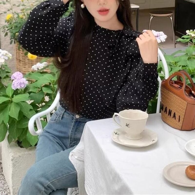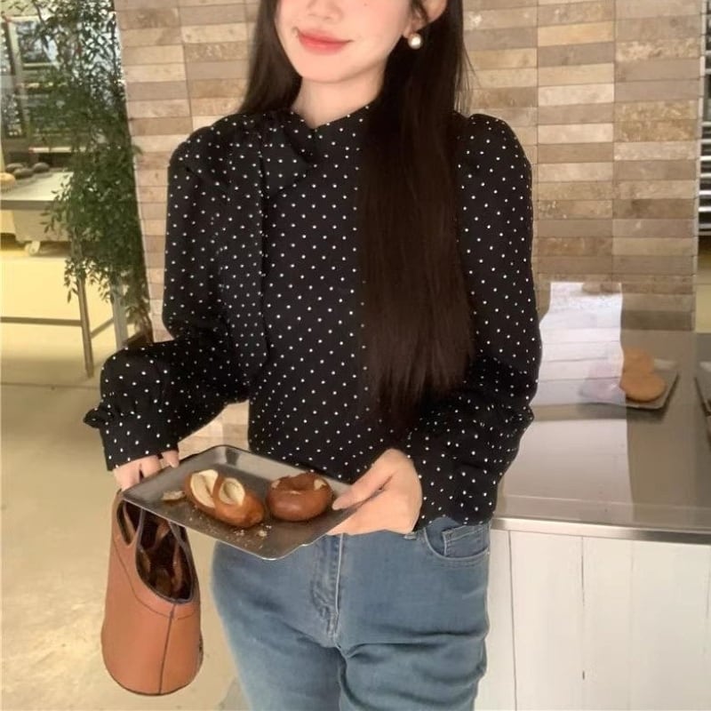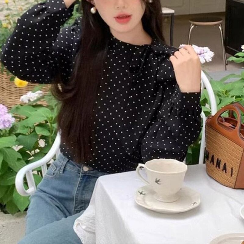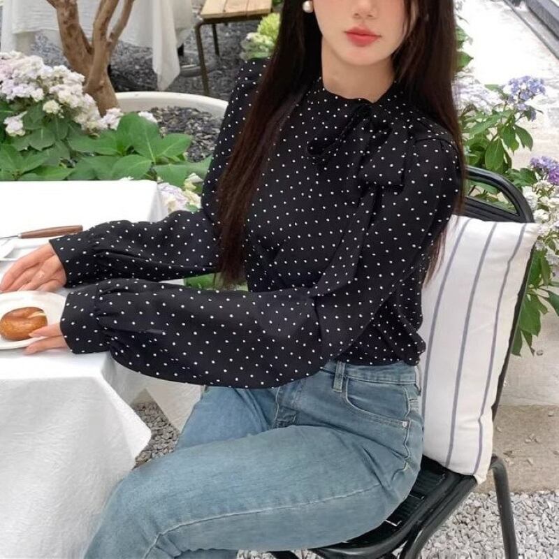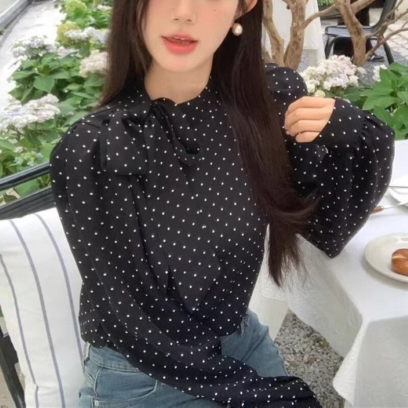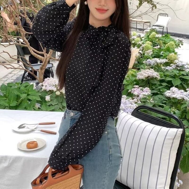 トップス シャツ ブラウス レディース プルオーバー ドットボウタイリボンブラウス 長袖 薄手 きれいめ 大人 おしゃれ 大人女子 エレガント 存在感 フォーマル ドット柄 春 秋 お出かけ 休日 旅行 普段使い 韓国系 スタイル 送料無料 S M L XL ブラック アイボリー