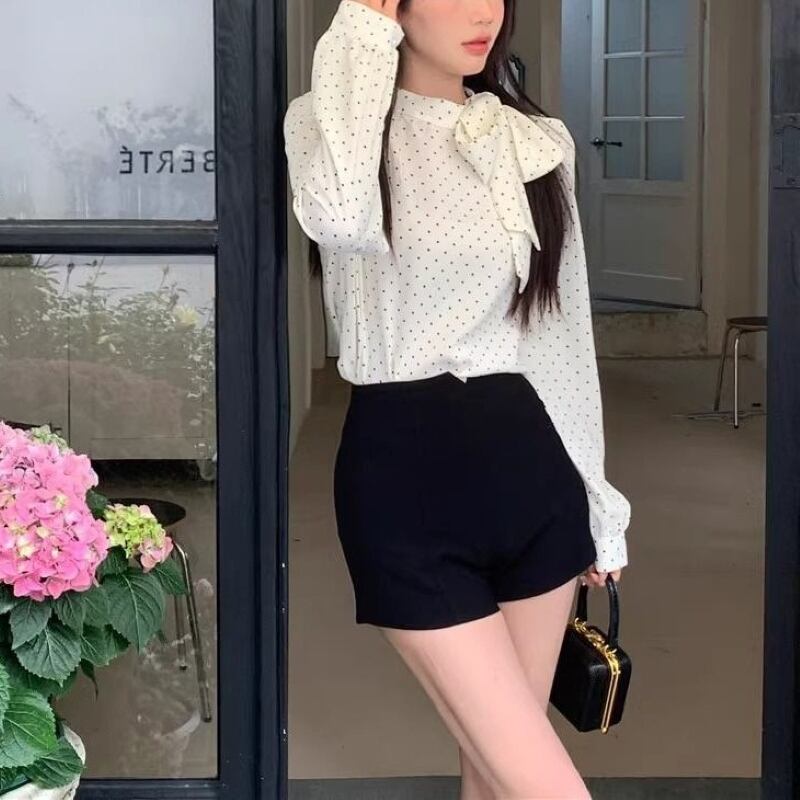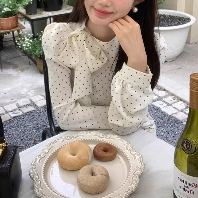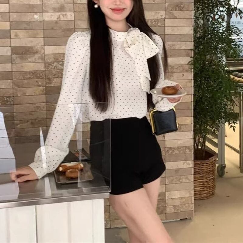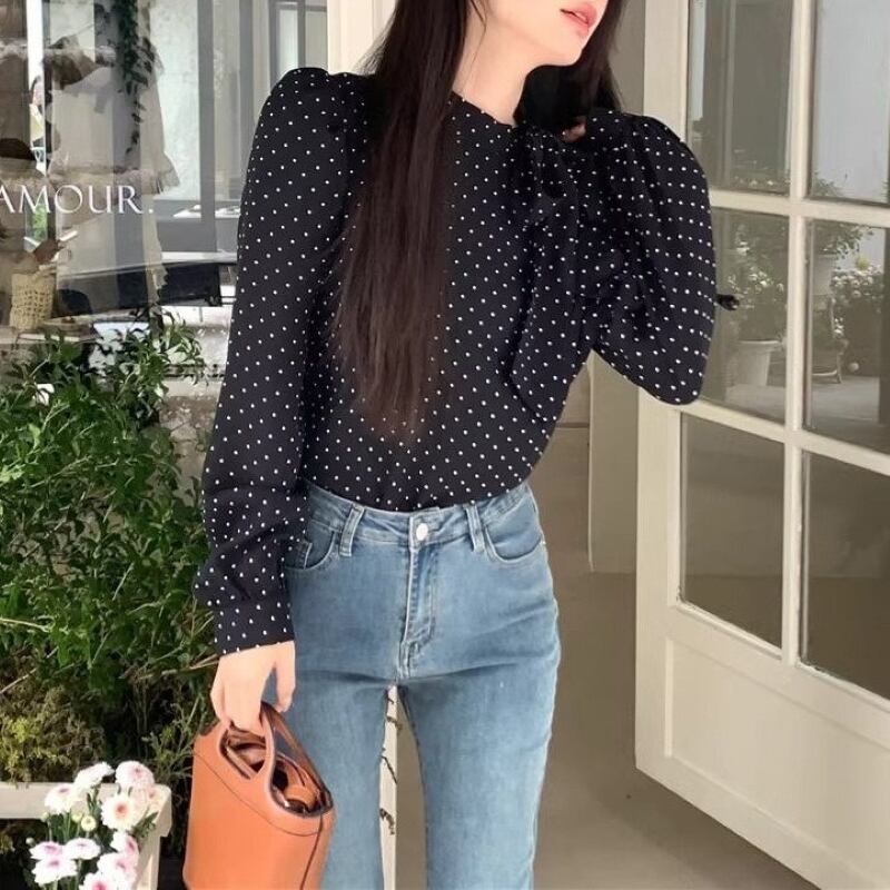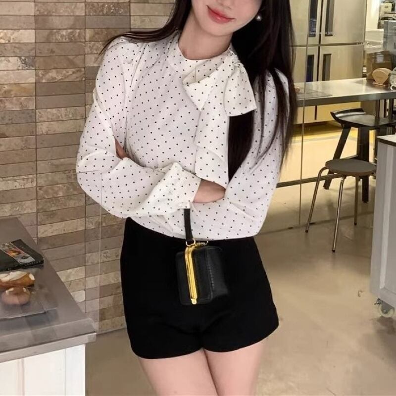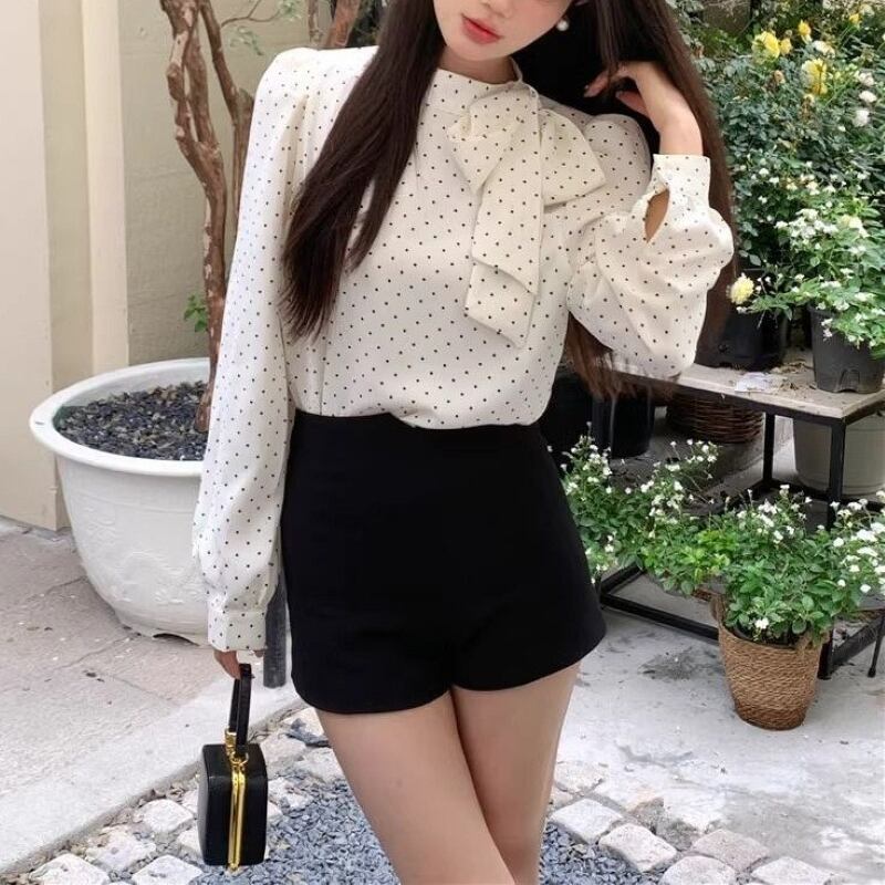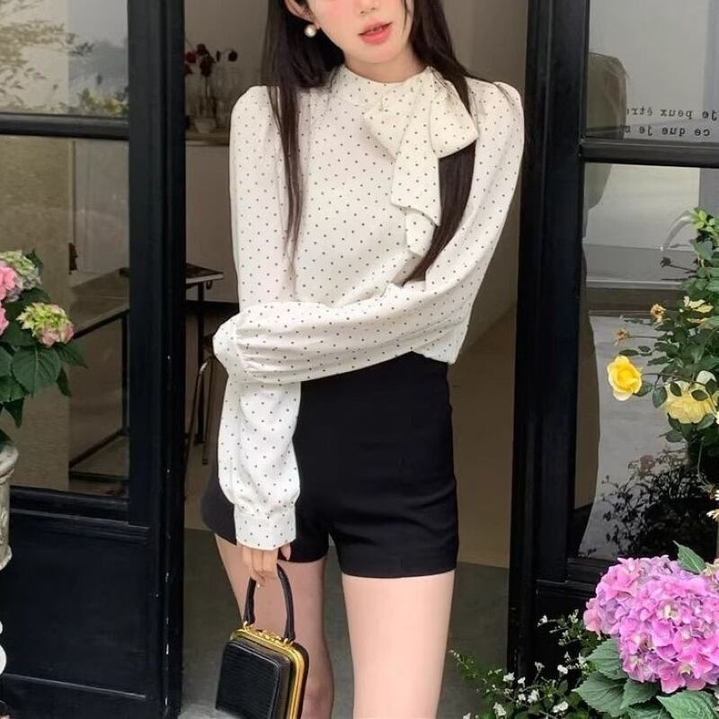 トップス シャツ ブラウス レディース プルオーバー ドットボウタイリボンブラウス 長袖 薄手 きれいめ 大人 おしゃれ 大人女子 エレガント 存在感 フォーマル ドット柄 春 秋 お出かけ 休日 旅行 普段使い 韓国系 スタイル 送料無料 S M L XL ブラック アイボリー