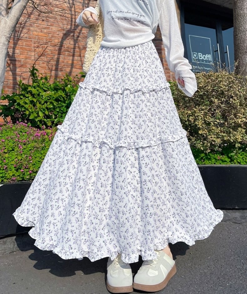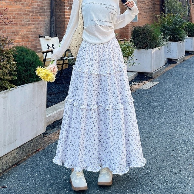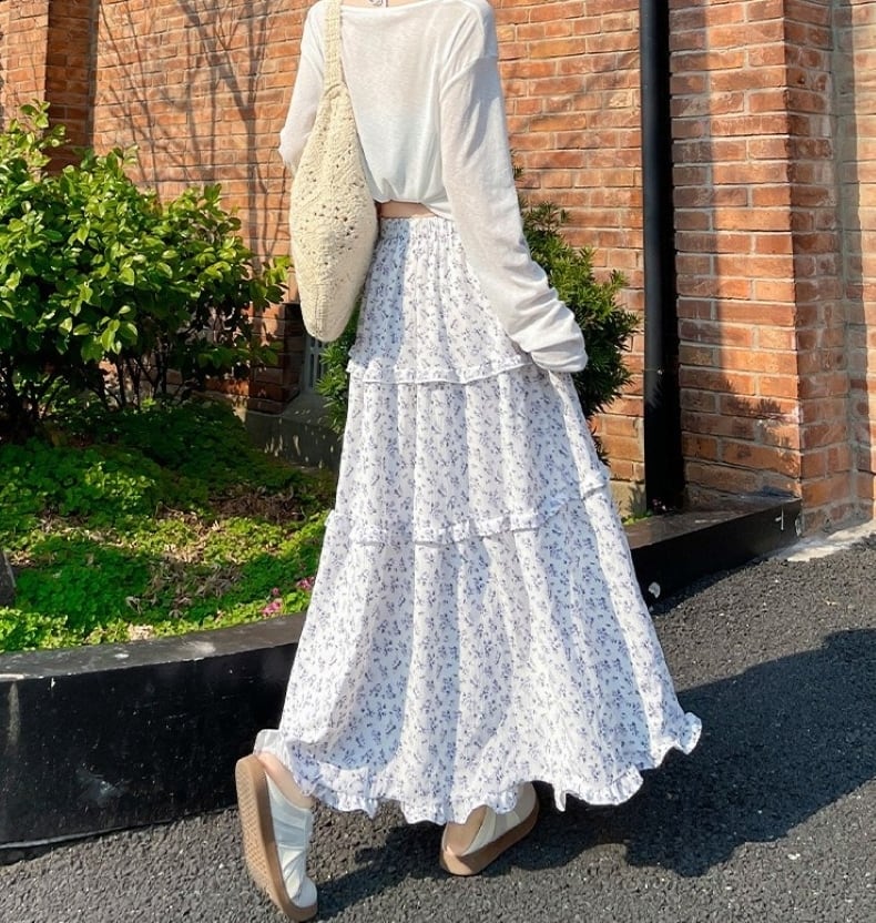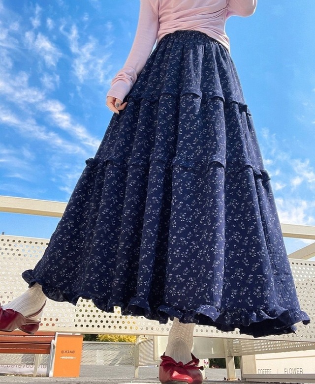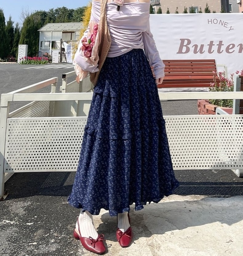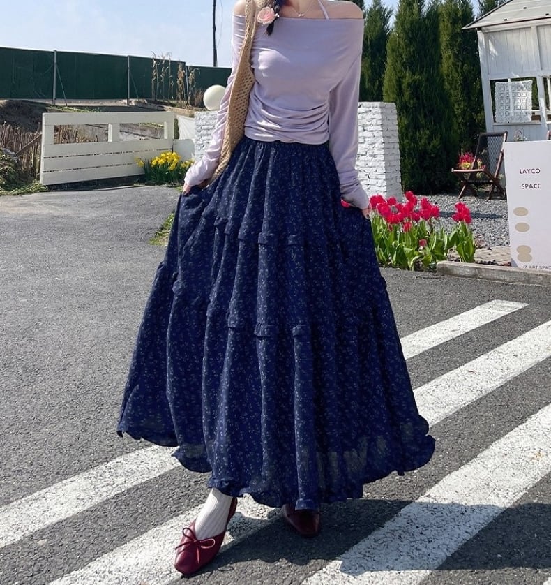 スカート レディース フレアスカート ティアードスカート 花柄 ロングスカート ミモレ丈 ハイウエスト ウエストゴム きれいめ 大人 おしゃれ 大人可愛い 大人女子 小花柄 デート お出かけ 休日 旅行 普段使い 韓国系 スタイル 楽ちん 体系カバー 送料無料 S M L XL ホワイト ネイビー