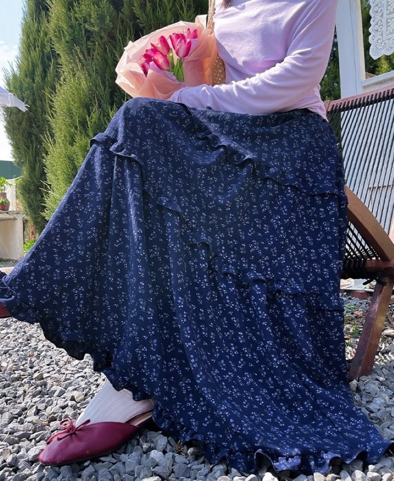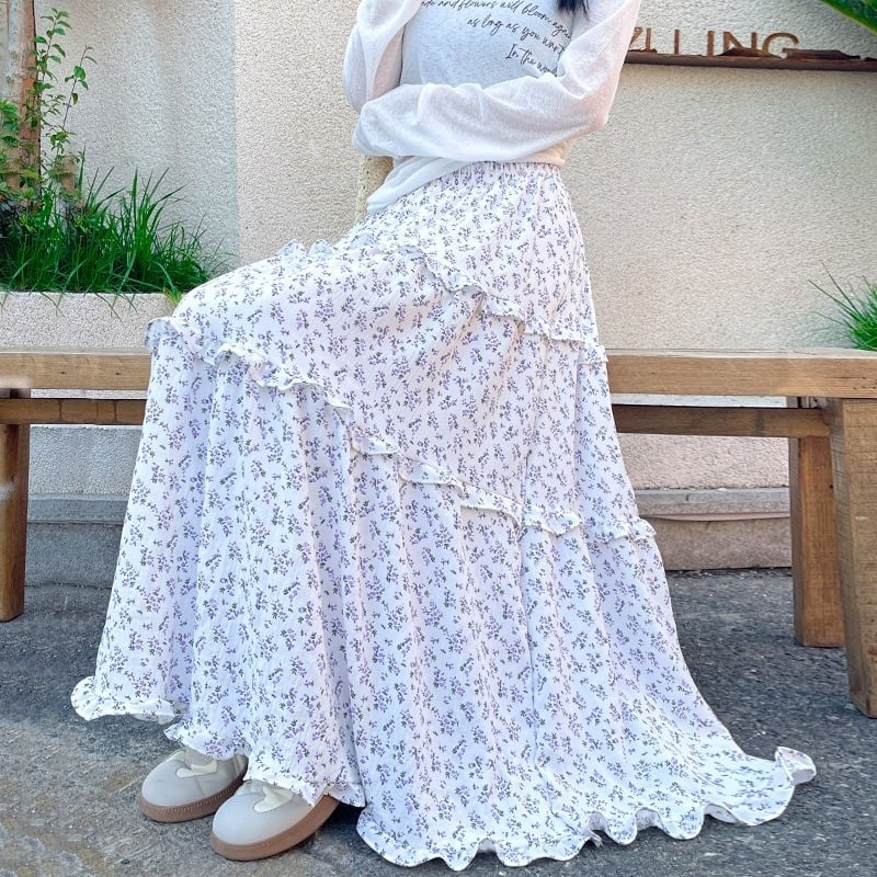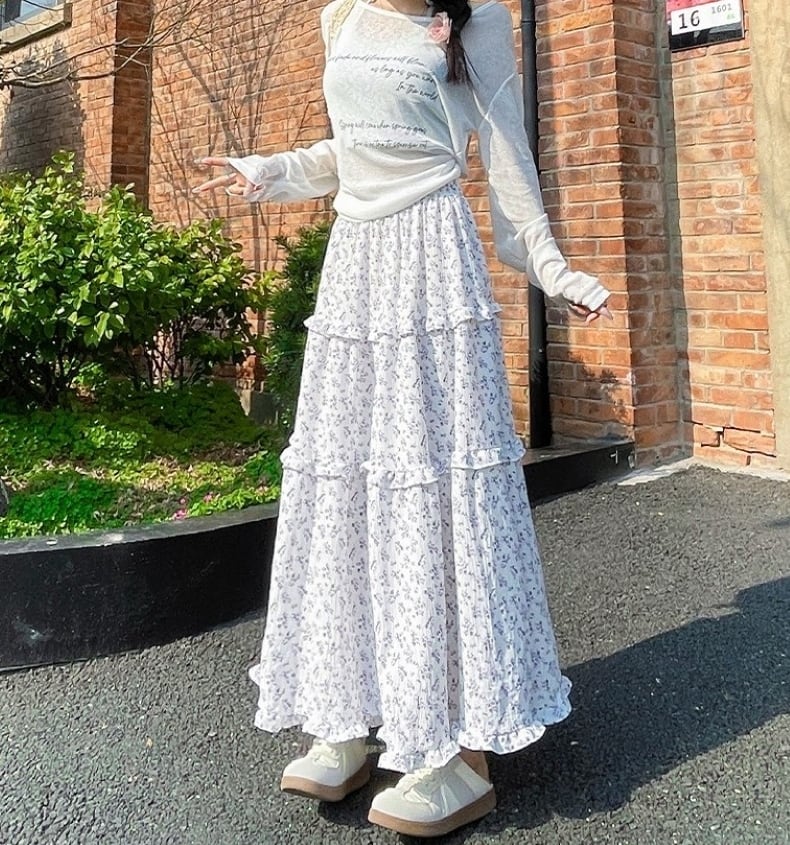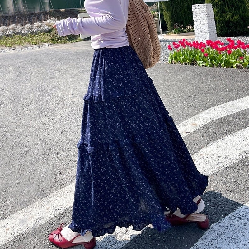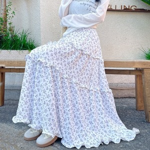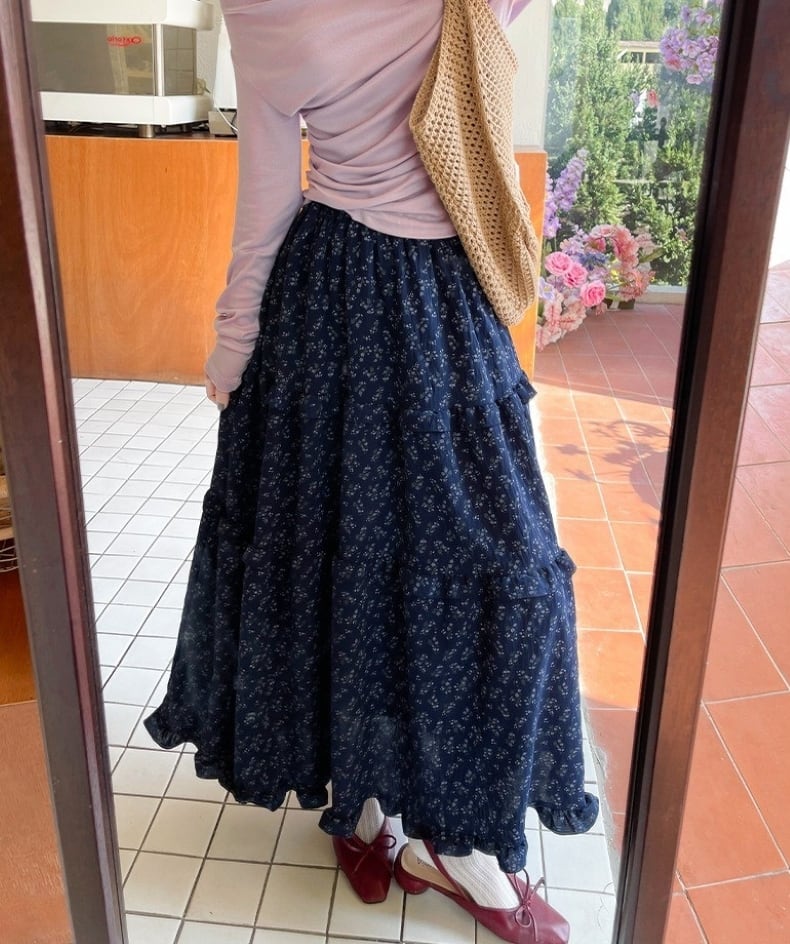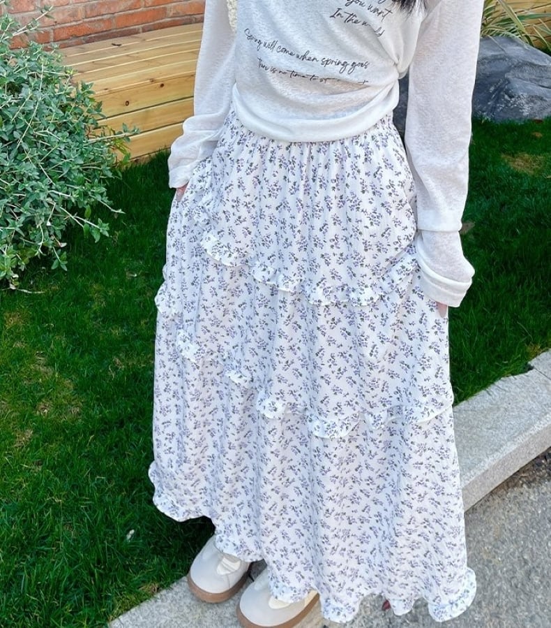 スカート レディース フレアスカート ティアードスカート 花柄 ロングスカート ミモレ丈 ハイウエスト ウエストゴム きれいめ 大人 おしゃれ 大人可愛い 大人女子 小花柄 デート お出かけ 休日 旅行 普段使い 韓国系 スタイル 楽ちん 体系カバー 送料無料 S M L XL ホワイト ネイビー
