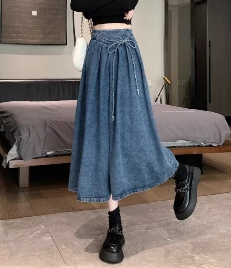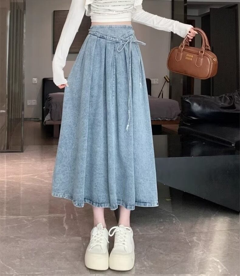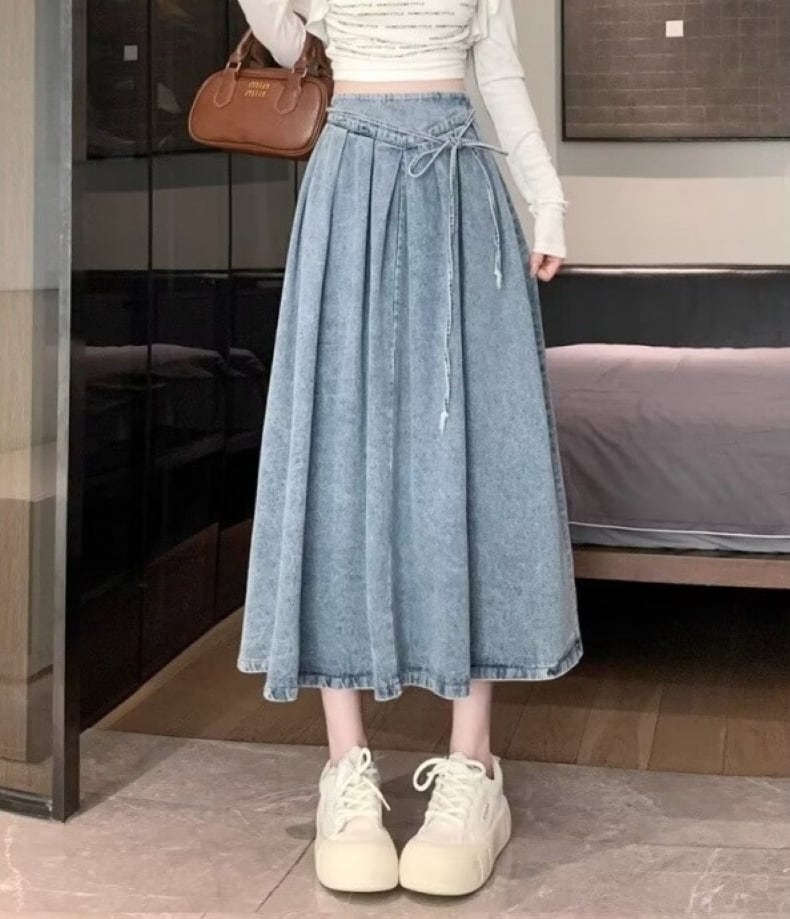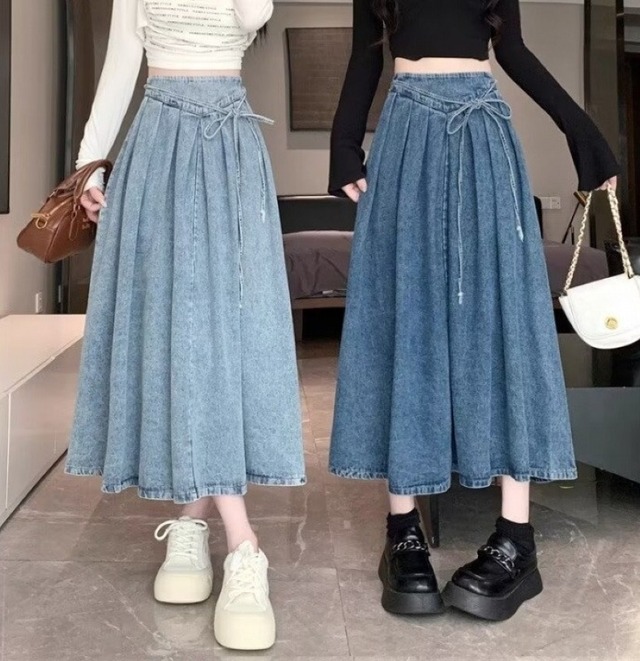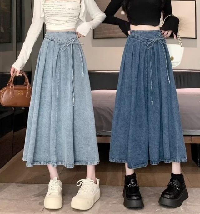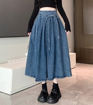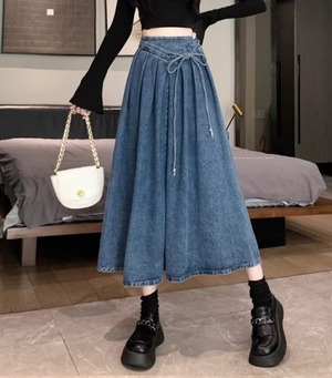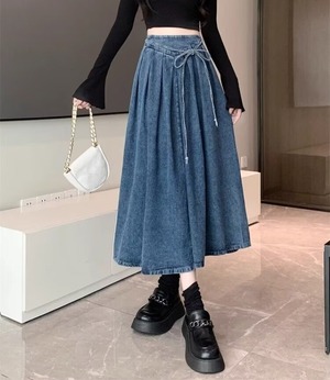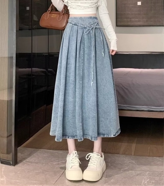 スカート ロングスカート レディース デニムスカート ロング プリーツスカート フレア Aライン ウエストリボン ハイウエスト ウエストゴム シンプル 大人 おしゃれ レトロ 大人可愛い 大人女子 とろみ感 春 夏 デート お出かけ 休日 アウトドア 旅行 普段使い 楽ちん 体系カバー 定番 送料無料 S M L XL 2XL 3XL ブルー ライトブルー