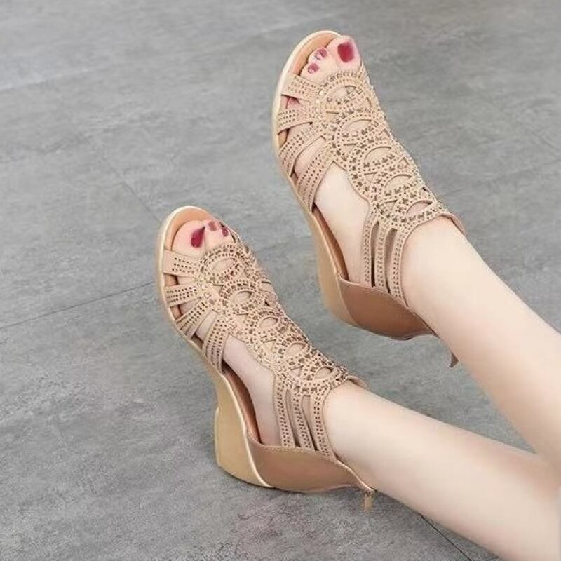 こちらのサンダルは、柔らかな素材で作られており、長時間の着用でも疲れにくい設計になっています。ウェッジソールが脚を美しく見せ、脚長効果も抜群です。春から夏にかけて、デートや休日のお出かけ、さらにはリゾートや旅行でのコーディネートにもぴったりです。シックなブラックと華やかなゴールドの2色展開は、どんなスタイルにもマッチし、存在感を引き立てます!