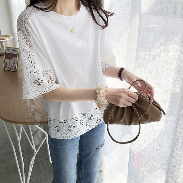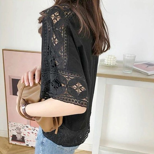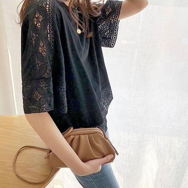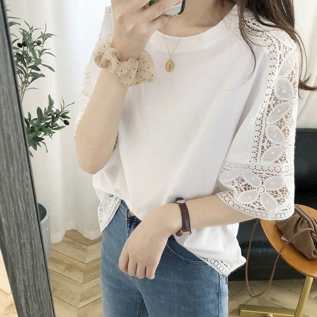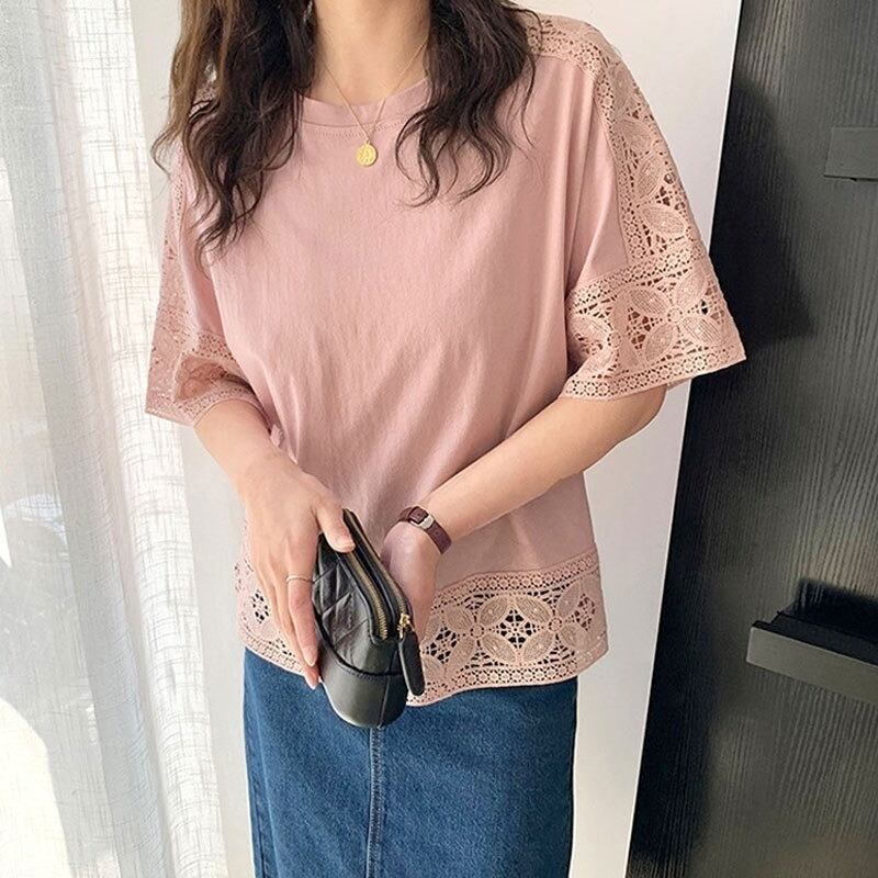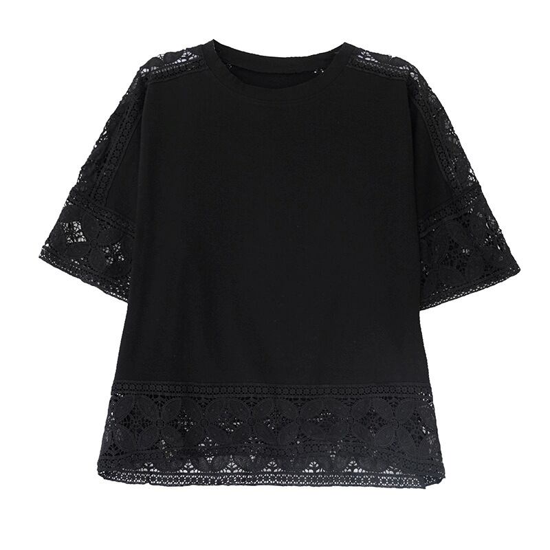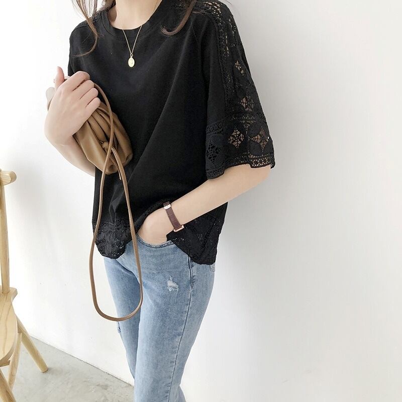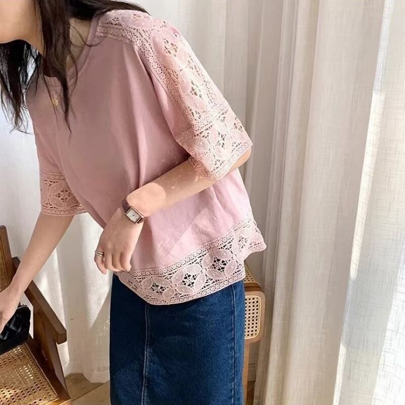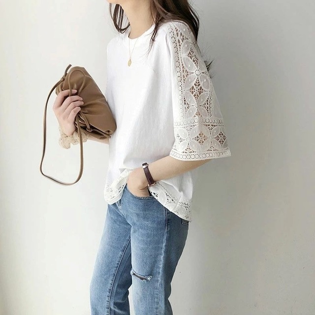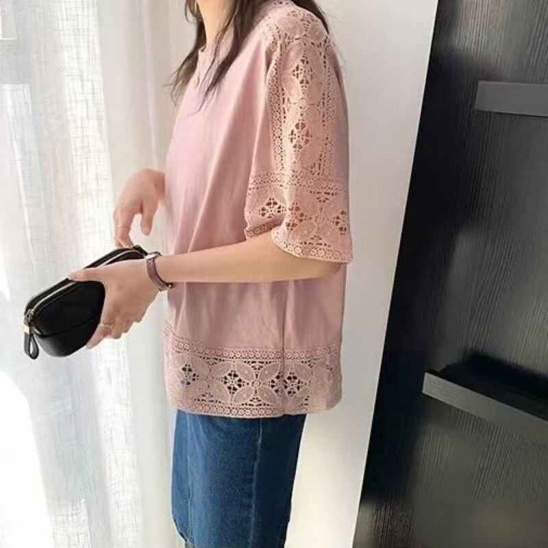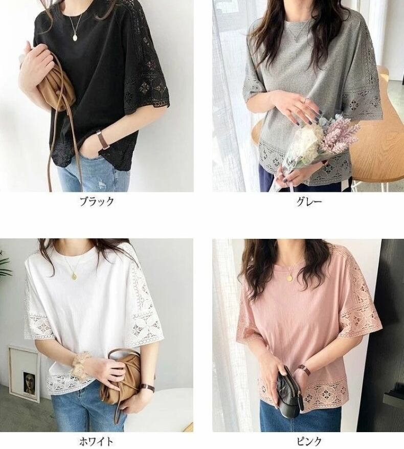 レース トップス プルオーバーカットソー レディース ブラウス Tシャツ 五分袖 クルーネック きれいめ シンプル 大人 おしゃれ 大人女子 エレガント 春 夏 デート お出かけ 休日 旅行 普段使い 楽ちん 体系カバー 送料無料 フリーサイズ ゆったり サイズ ホワイト ブラック グレー ピンク