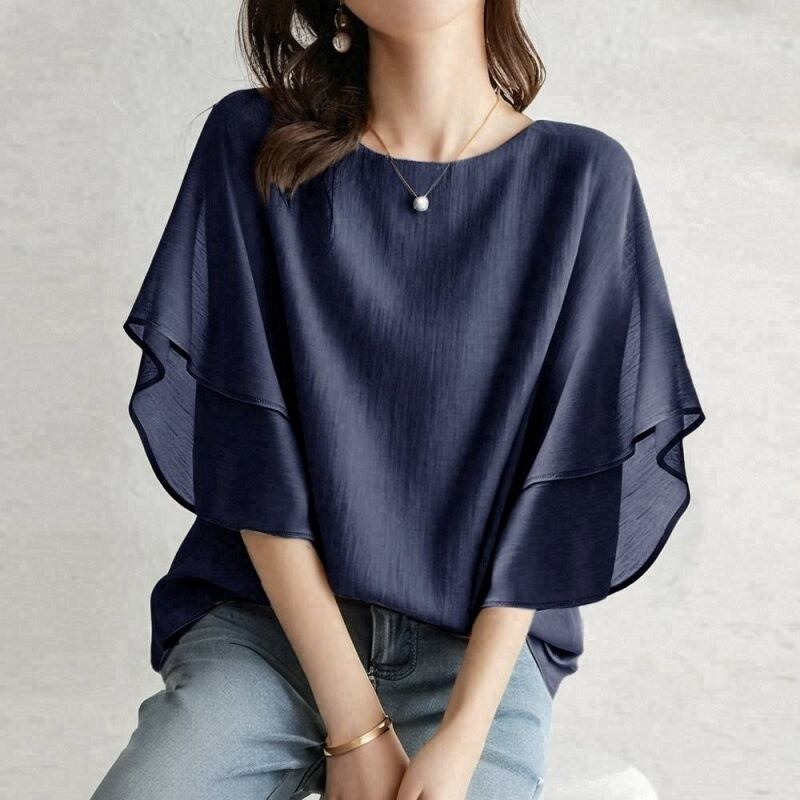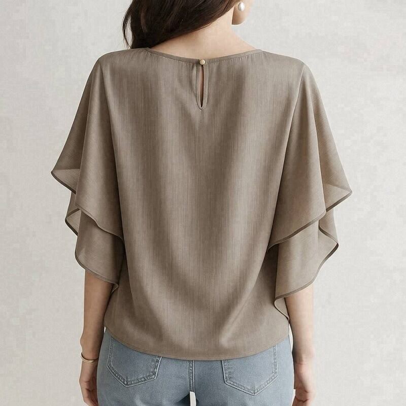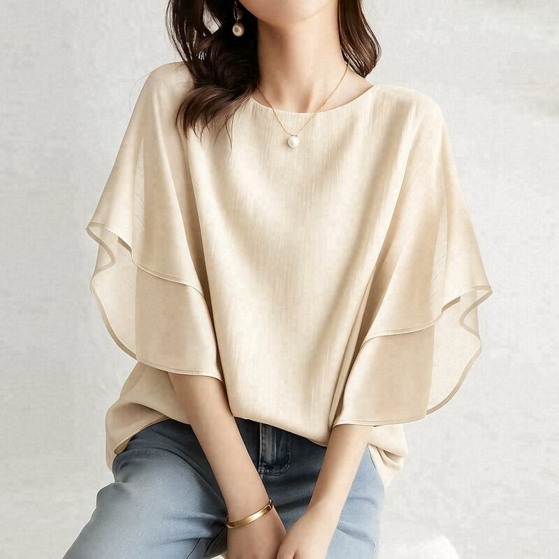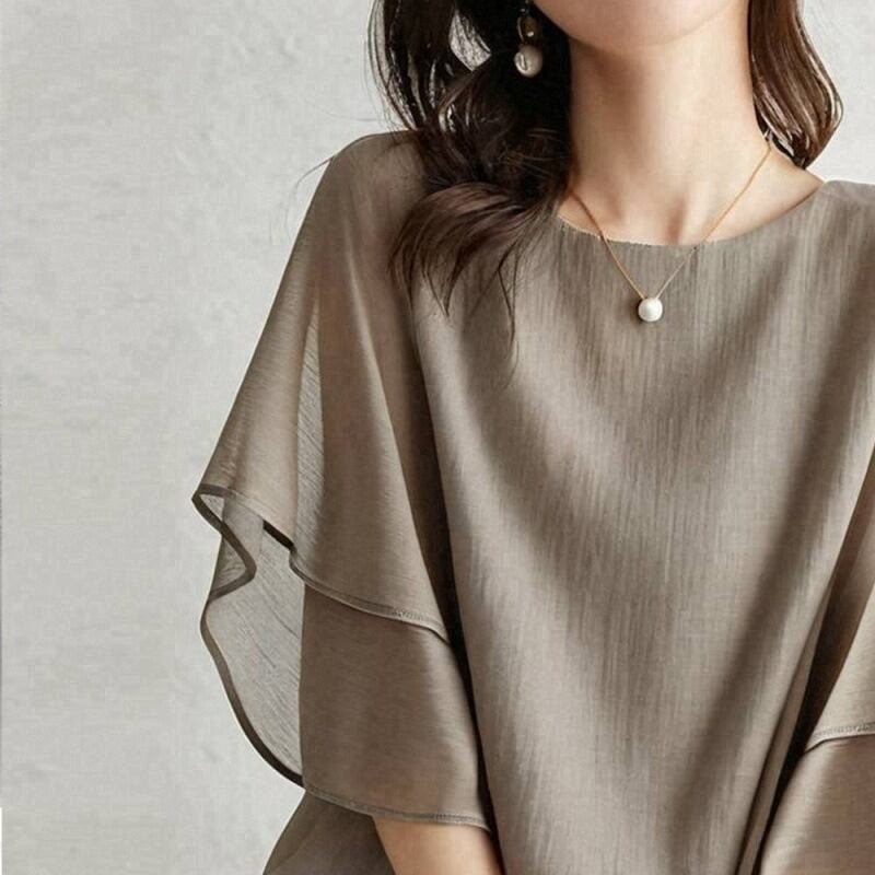 大人女子にぴったりなおしゃれで上品な「トップス シャツ ブラウス レディース スーツインナー フリル袖 フレアスリーブ 二の腕カバー プルオーバー シフォン 薄手」のご提案です!このブラウスは、シンプルでありながらも洗練された印象を与える魅力的なアイテムです。
