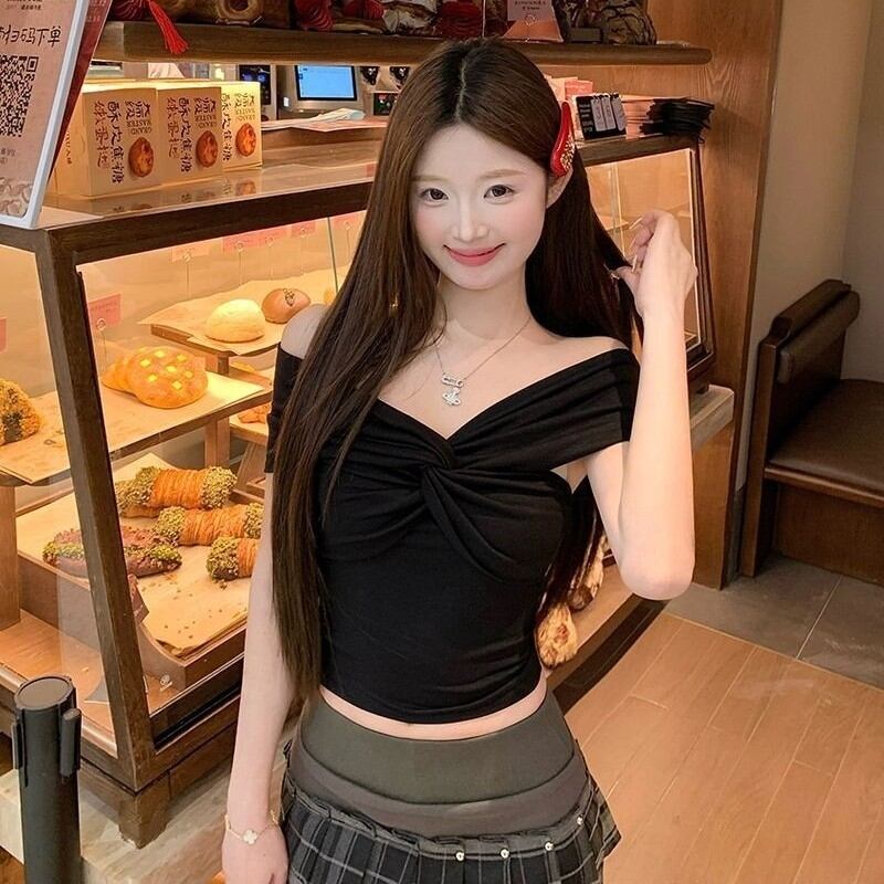 大人女子にぴったりなおしゃれでセクシーな「オフショルダー Tシャツ クロスデザイン レディース トップス スリムフィット ショート丈 カットソー 半袖」のご提案です!このTシャツは、魅力的なクロスデザインが特徴で、大人可愛いスタイルを引き立てます。