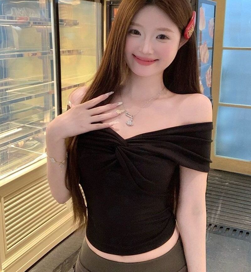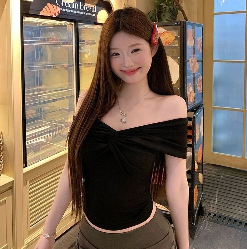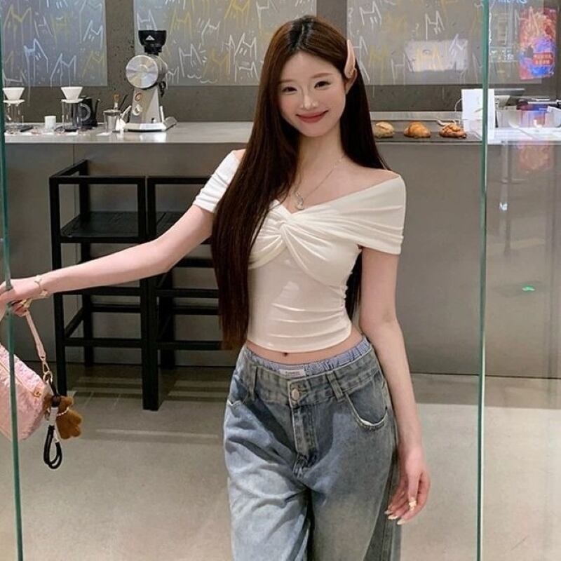 オフショルダー Tシャツ クロスデザイン レディース トップス スリムフィット ショート丈 カットソー 半袖 大人 おしゃれ 大人可愛い 大人女子 セクシー 存在感 春 夏 デート お出かけ 休日 旅行 普段使い 韓国系 ファッション スタイル 送料無料 S M L XL ホワイト ブラック