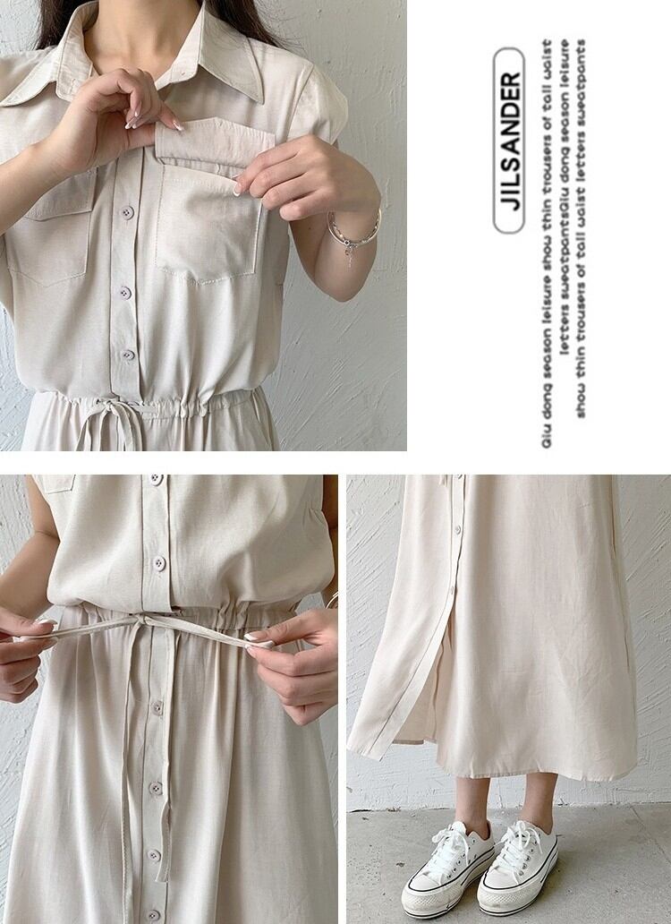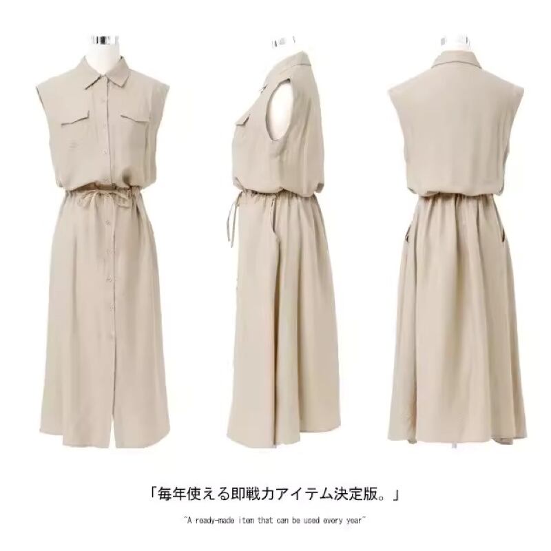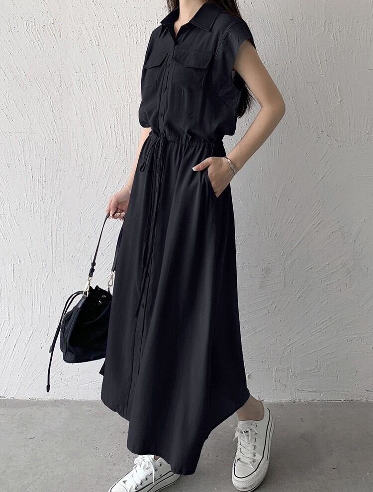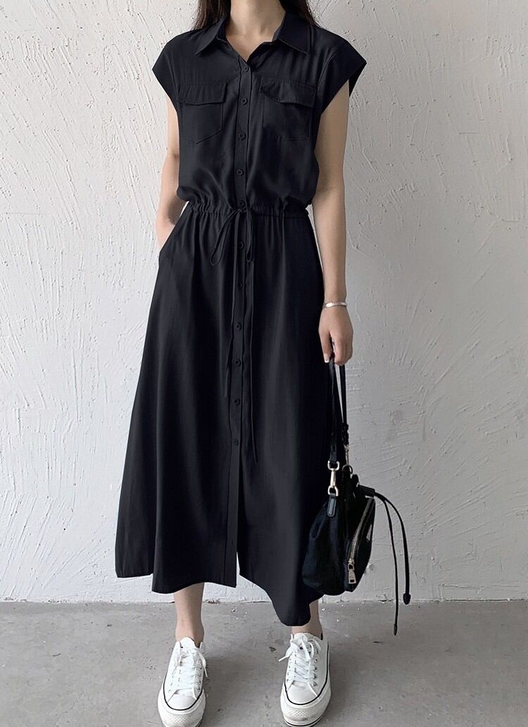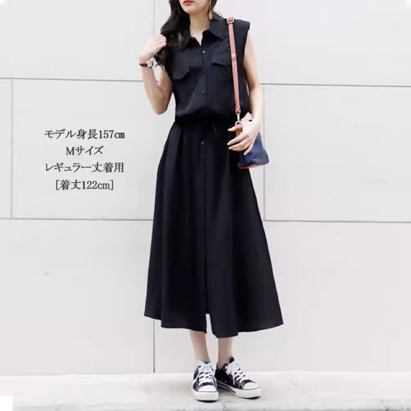 ワンピース ロングワンピース レディース シャツワンピース ノースリーブ 襟付き ウエストマーク ポケット ハイウエスト きれいめ シンプル 大人 おしゃれ 大人女子 エレガント 存在感 春 夏 デート お出かけ 休日 旅行 海 普段使い 体系カバー 送料無料 S M L XL 2XL ブラック ブルー ベージュ