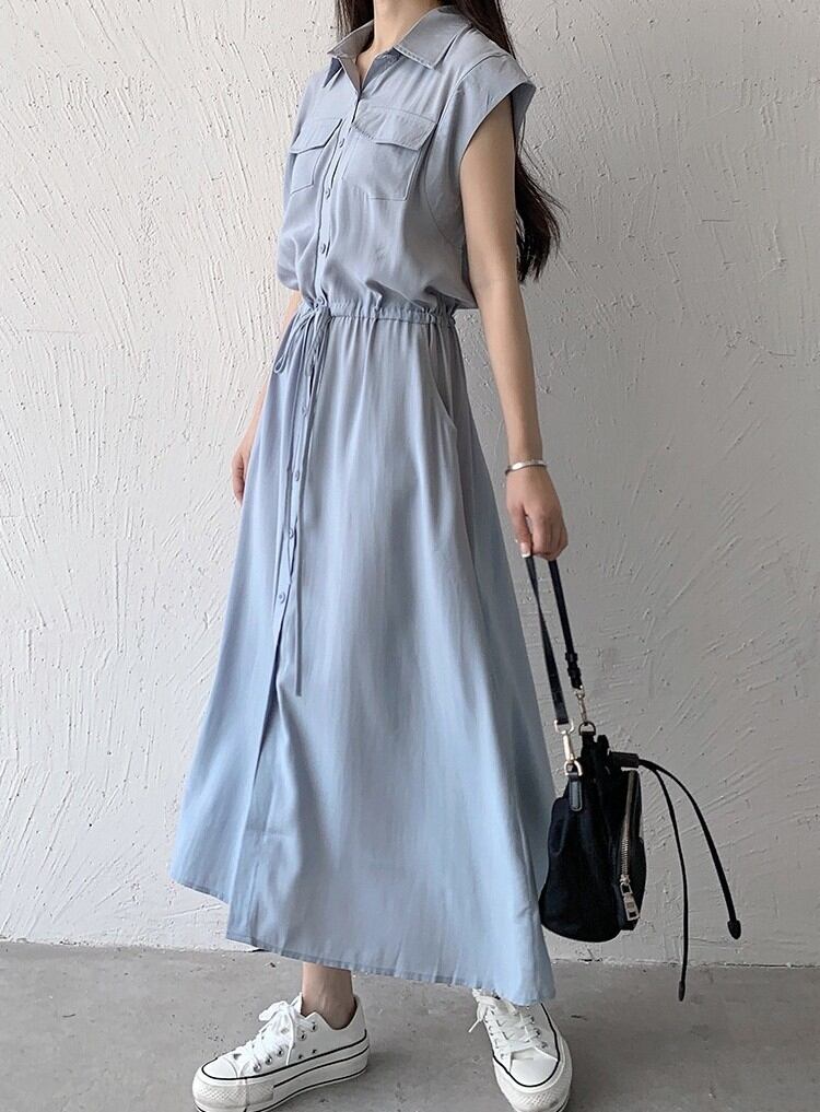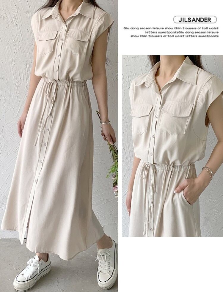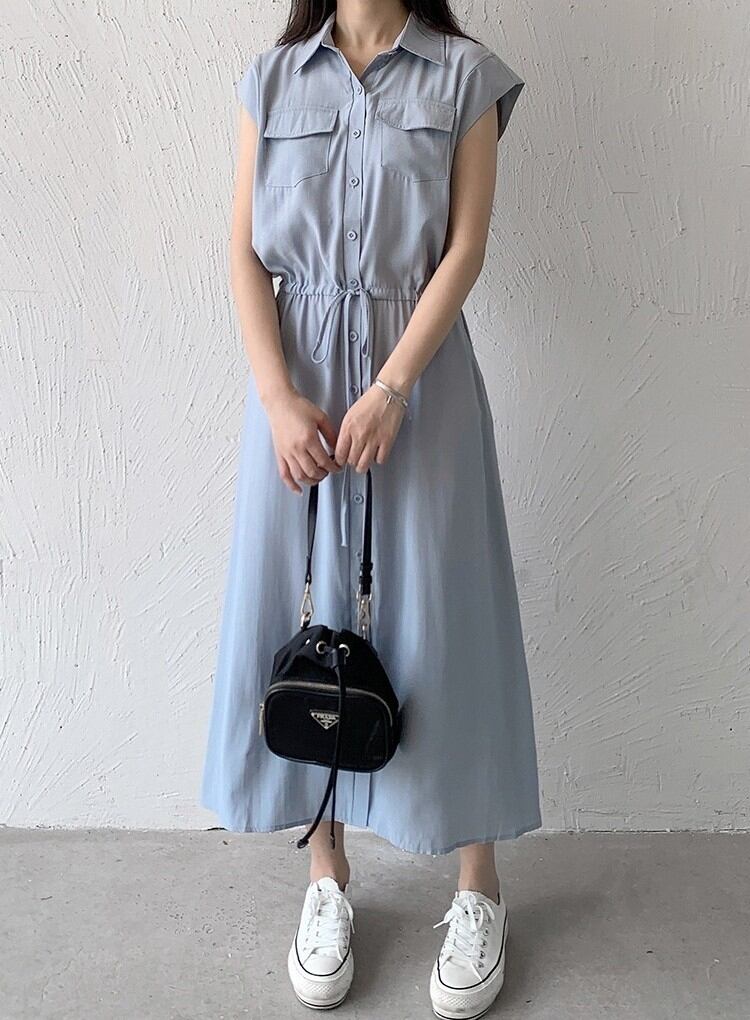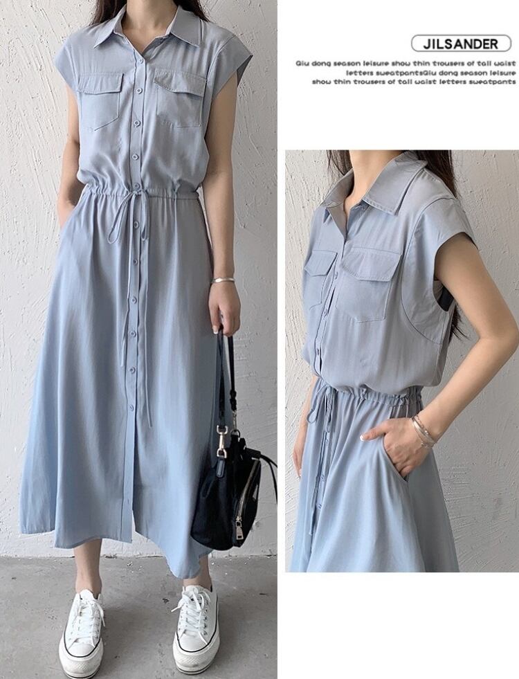 ワンピース ロングワンピース レディース シャツワンピース ノースリーブ 襟付き ウエストマーク ポケット ハイウエスト きれいめ シンプル 大人 おしゃれ 大人女子 エレガント 存在感 春 夏 デート お出かけ 休日 旅行 海 普段使い 体系カバー 送料無料 S M L XL 2XL ブラック ブルー ベージュ