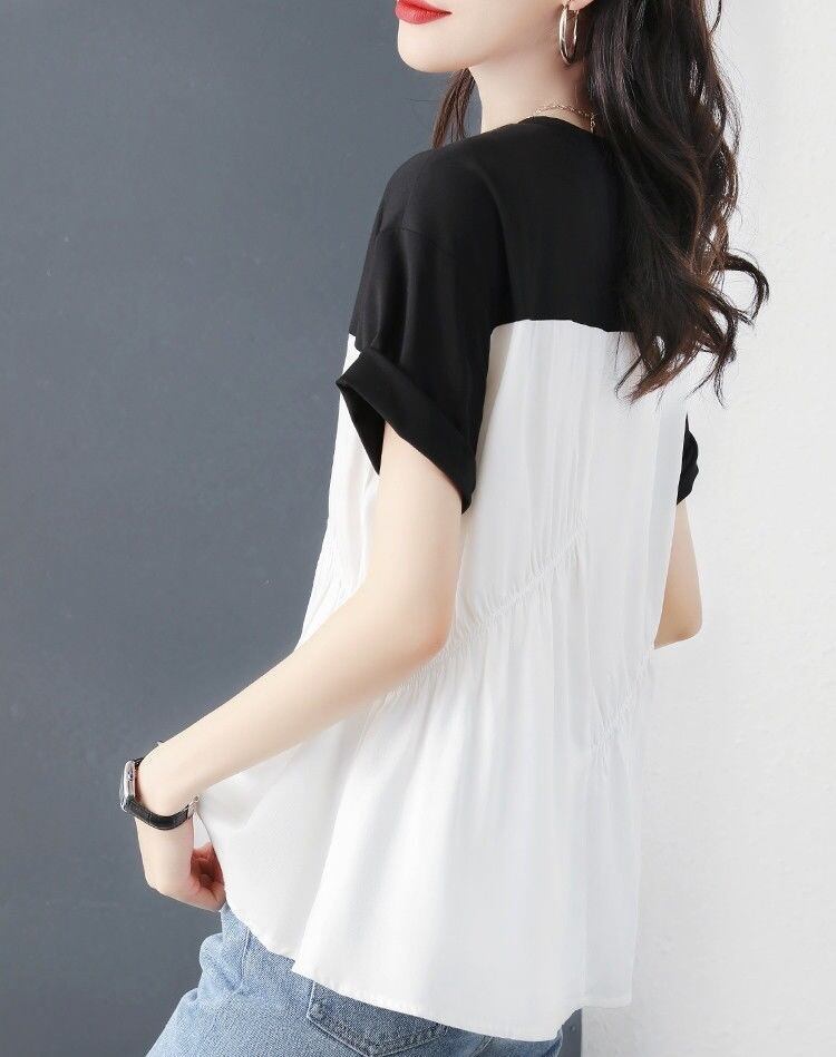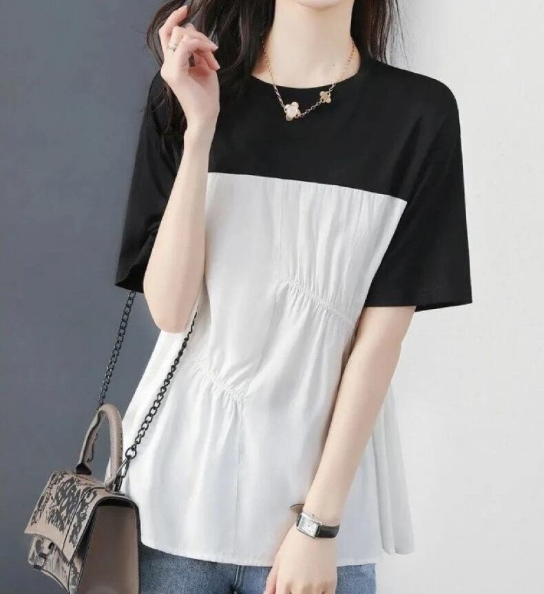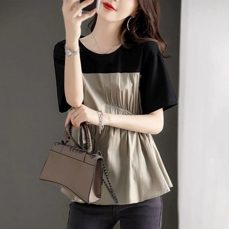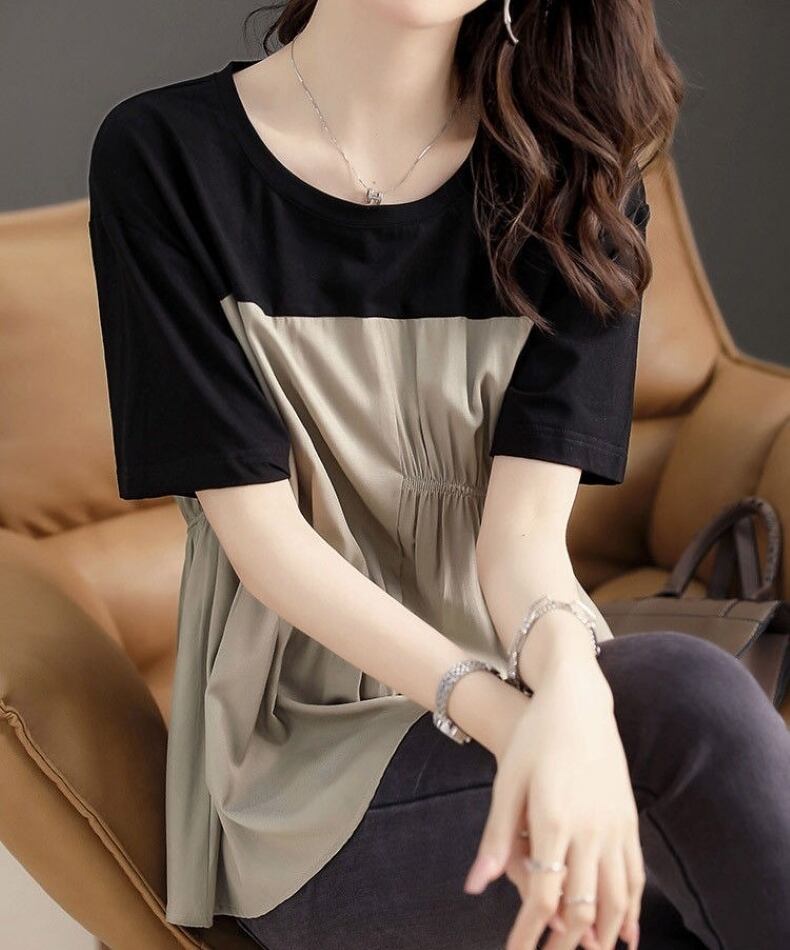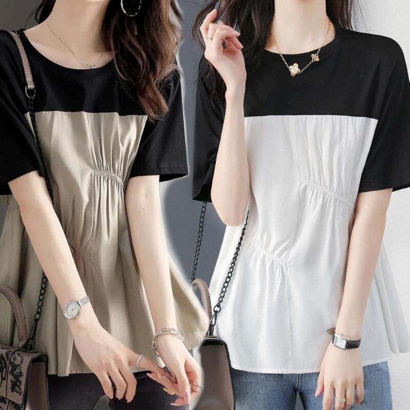 大人女子にぴったりなおしゃれで上品な「トップス Tシャツ ブラウス レディース プルオーバー 半袖 クルーネック ギャザー 切り替え」のご提案です!このTシャツは、シンプルでありながら洗練されたデザインが特徴で、大人の魅力を引き立てるアイテムです。