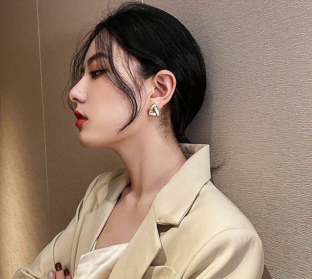幾何学的な三次元三角形の立体的な三角形のデザインがおしゃれな、大人可愛いピアスです。きれいめな装いにも、カジュアルスタイルにも合わせやすく、幅広いシーンで活躍します。