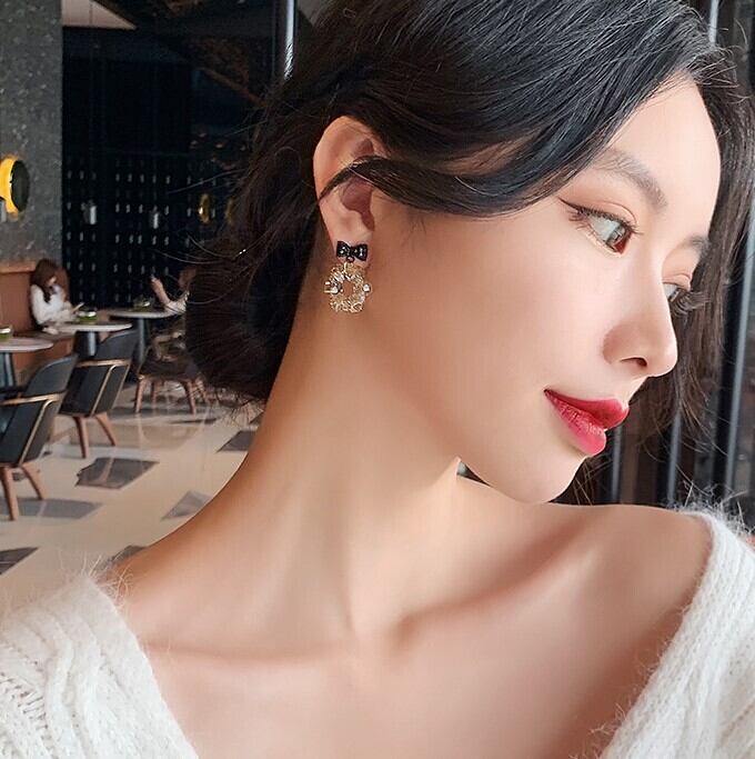 ブラック ボウクリスタル ピアス かわいい カジュアル おしゃれ エスニック 大人可愛い 花柄 レディース 女性用 お出かけ 女子会 お泊まり 休日 旅行 お買い物 韓国 ファッション スタイル プレゼント オールシーズン 小さめ