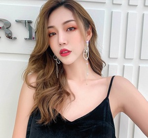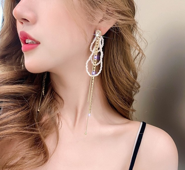 高級感メタリックラウンドフラワーパールイヤリング女性ロングタッセル気質スタッドは、丸い顔の誇張された耳飾りに適しています