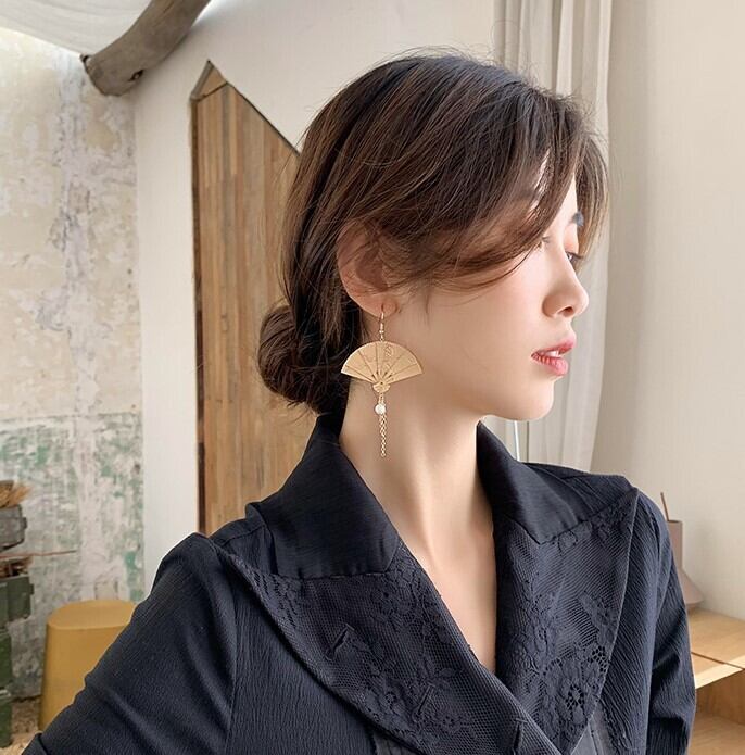 流行の中国スタイルのイヤリングレトロファン漢服金箔古代スタイルのタッセル日本の耳フック夏