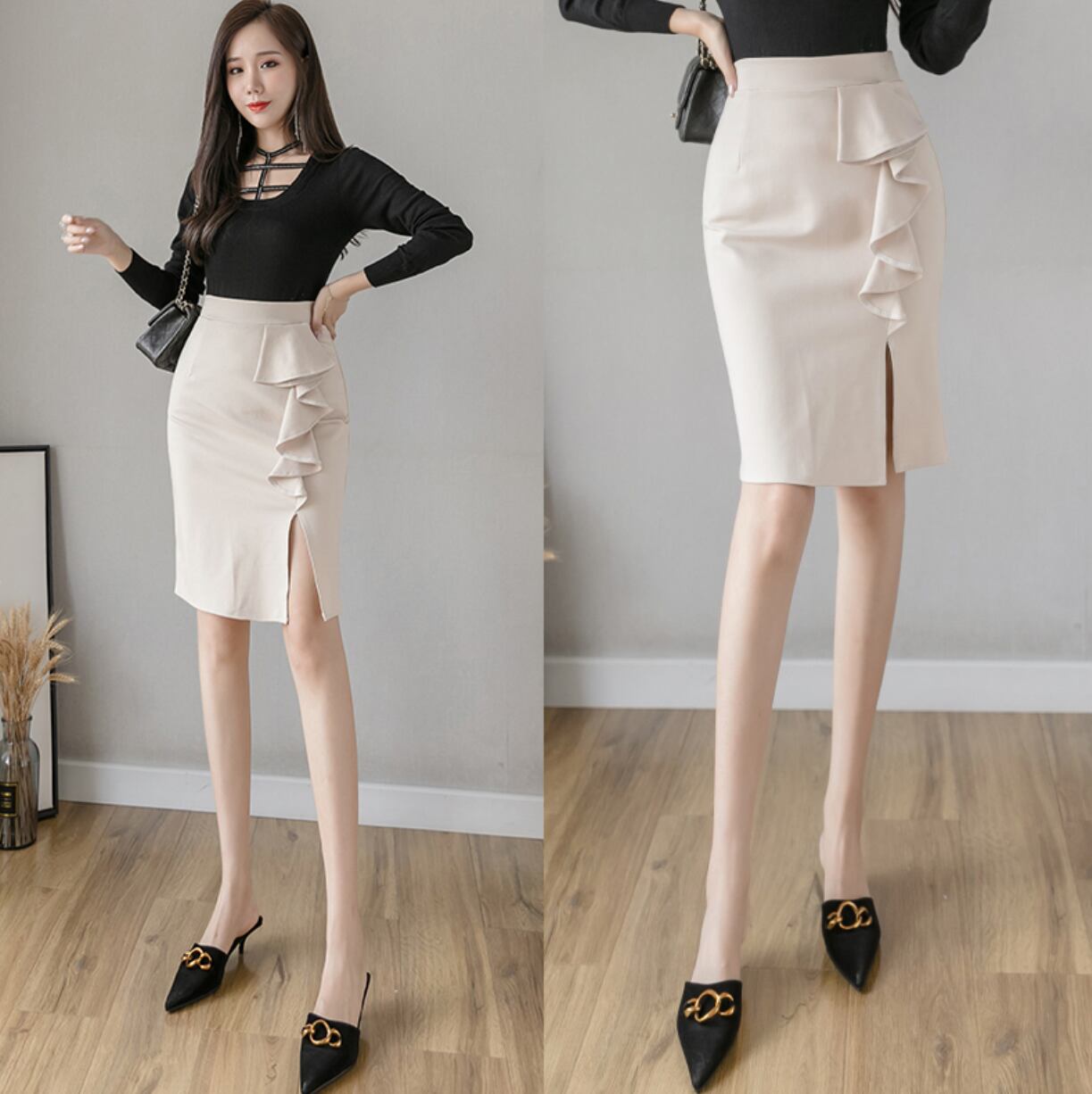 ハイウエスト スカート ひざ丈 スリム タイト フリル スリット 韓国 ブラック レッド オフホワイト