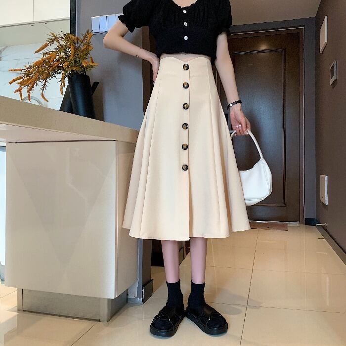 Aラインスカートです。上品で大人可愛いスタイルを演出するブラックとホワイトの二色展開のスカートです。スリムで細身のシルエットが、脚長効果を発揮しスマートな印象を与えます。