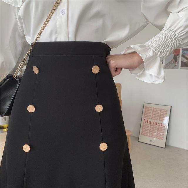 女性らしいスタイルをつくる上で欠かせないアイテムです。ブラックの無地が、大人の上品さとスマートさを演出します。カジュアルにも着こなせるので、幅広いシーンで活躍してくれます。。フロントにボタンが付きAラインスカートです。