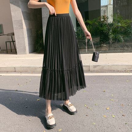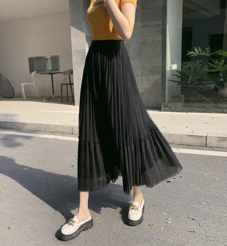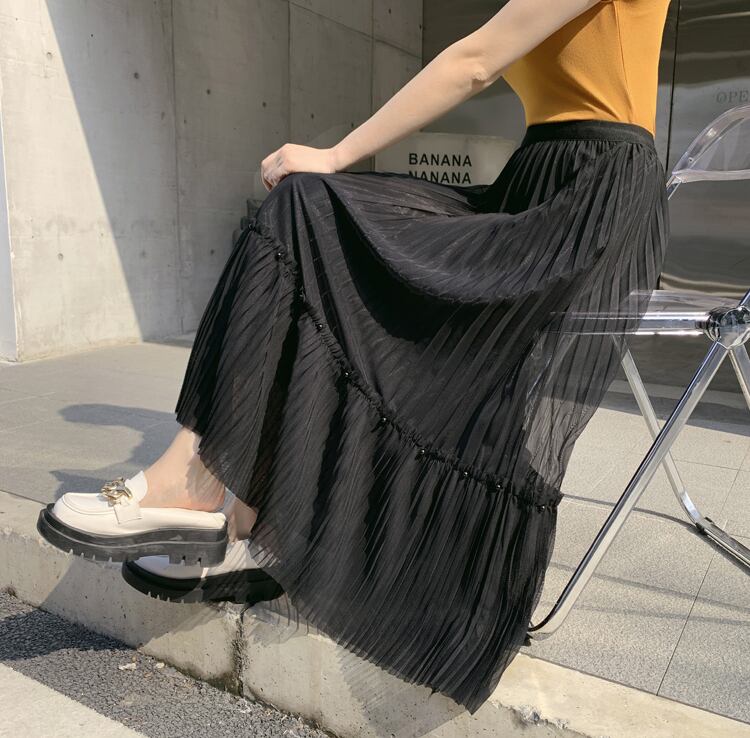 大人かわいいロングスカートです。メッシュスカート2022年新作ハイウエストAラインプリーツサンドスカートロングビーズケーキスカートガーゼスカートレディース春秋