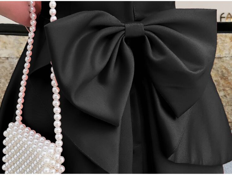 バックの大き目リボンとふんわりフレアがキュートな一枚。