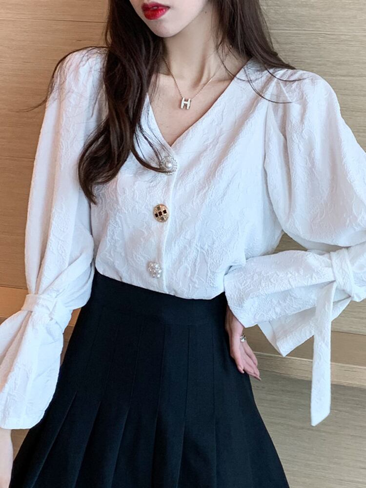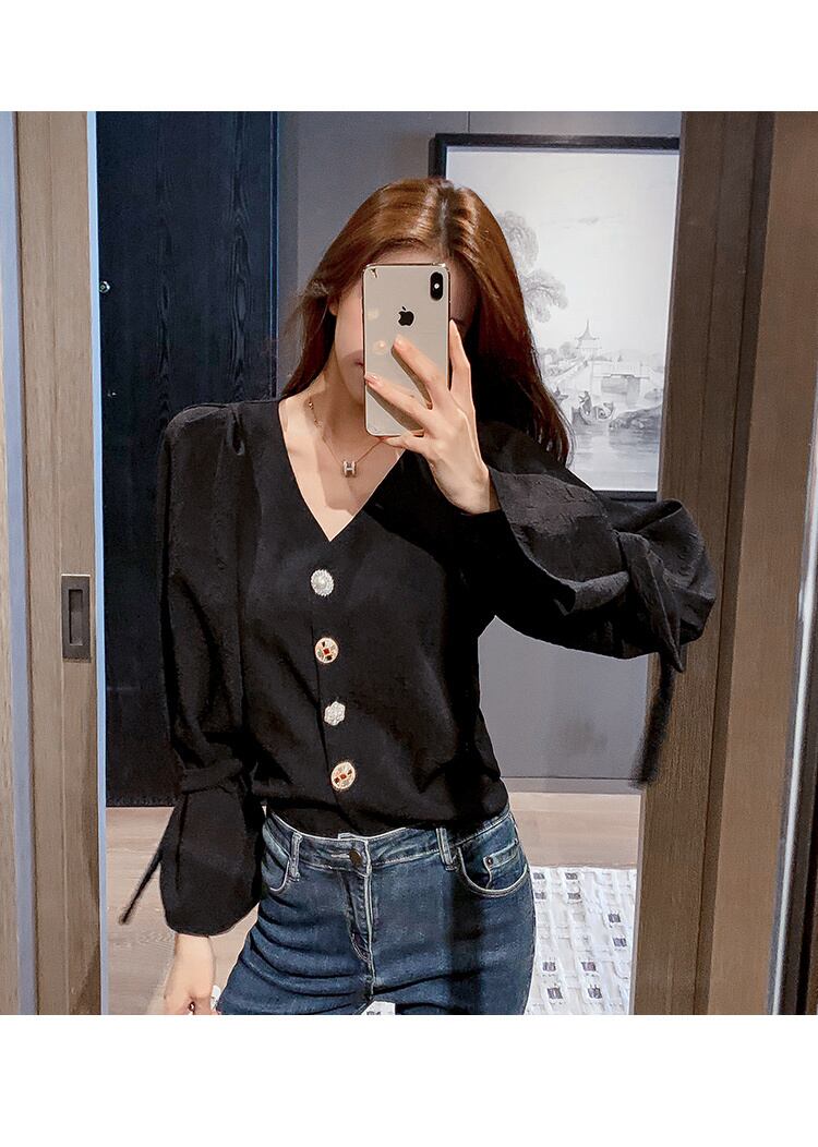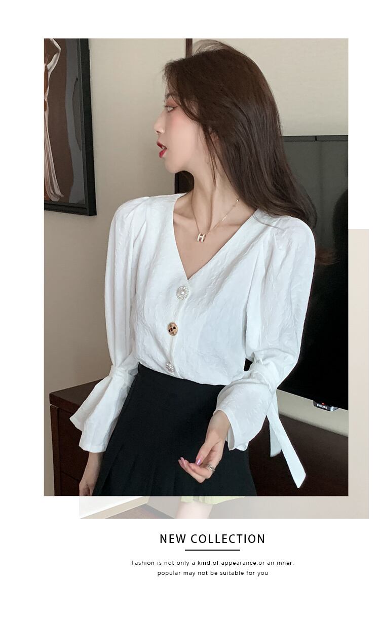大人かわいいレディースシャツです。シャツレディースレトロ香港フレーバー2022春婦人服デザインセンストランペットスリーブトップスウィート気質Vネックシャツ