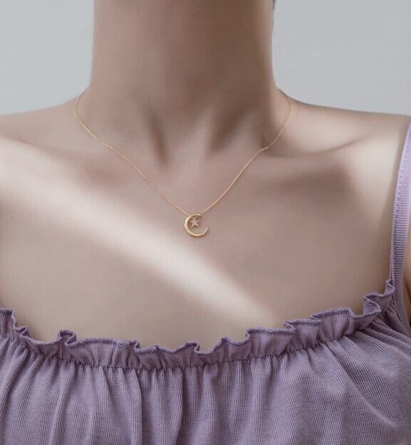 星と月のモチーフが美しく輝く、スターリング シルバー スタームーン ネックレス。シンプルなデザインだから、きれいめや上品なコーデにも合わせやすく、年齢を問わずおすすめです。