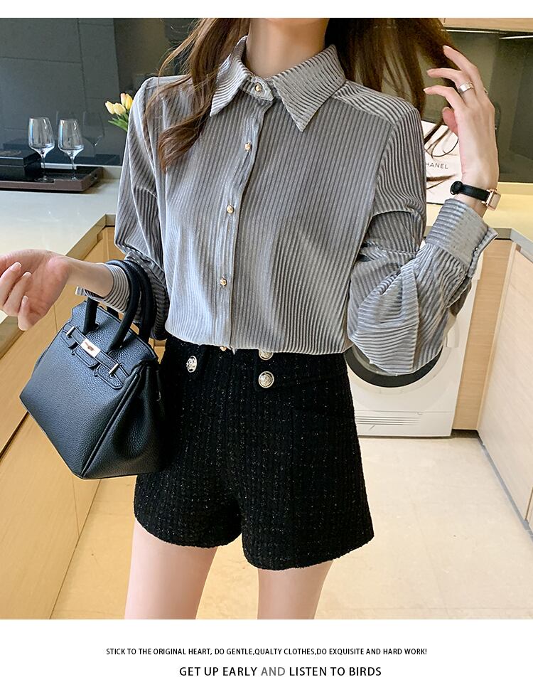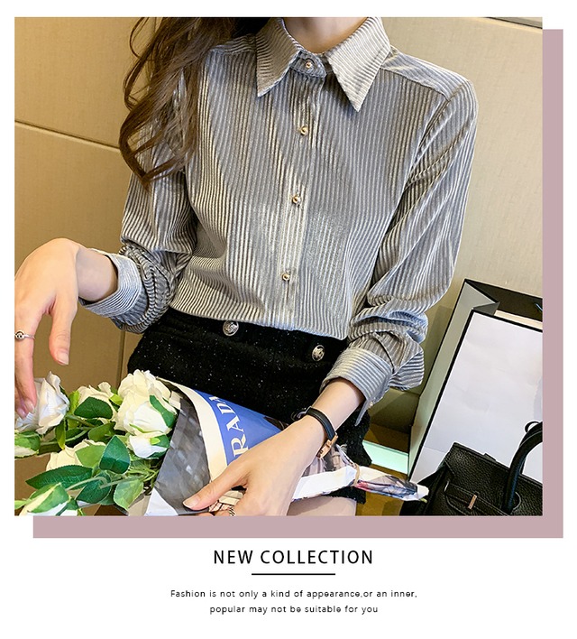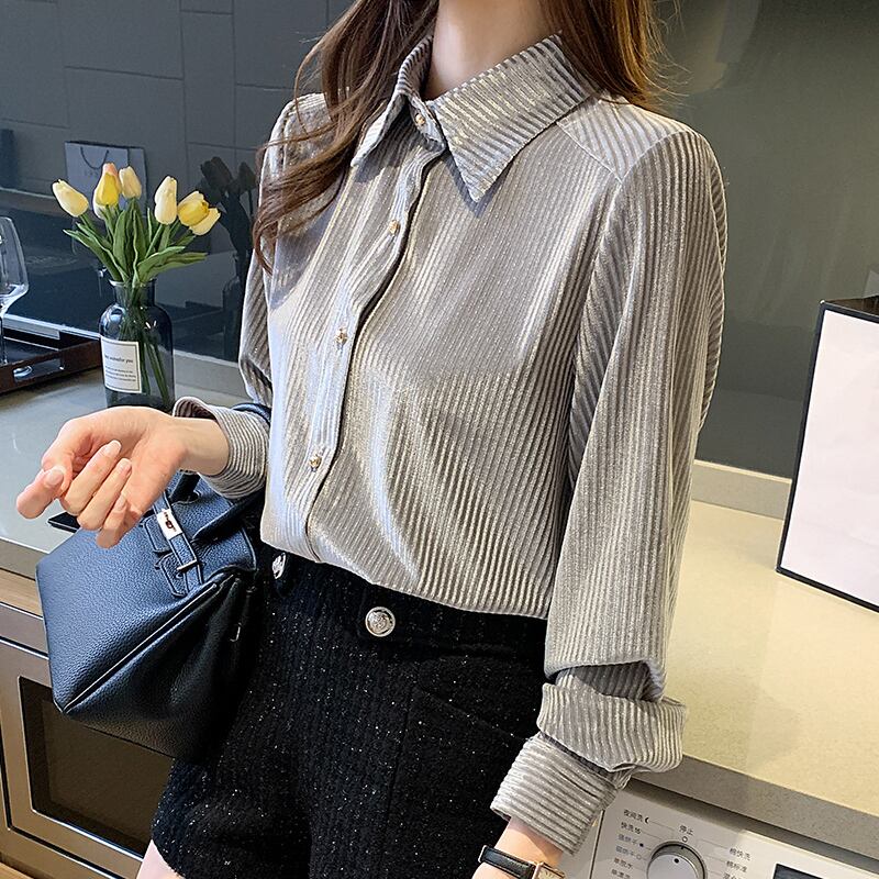 通勤にも使えるブラウスです。2022年春の新通勤プロホワイトシャツレディース長袖デザインレイヤードゴールドベルベットボトミングシャツ
